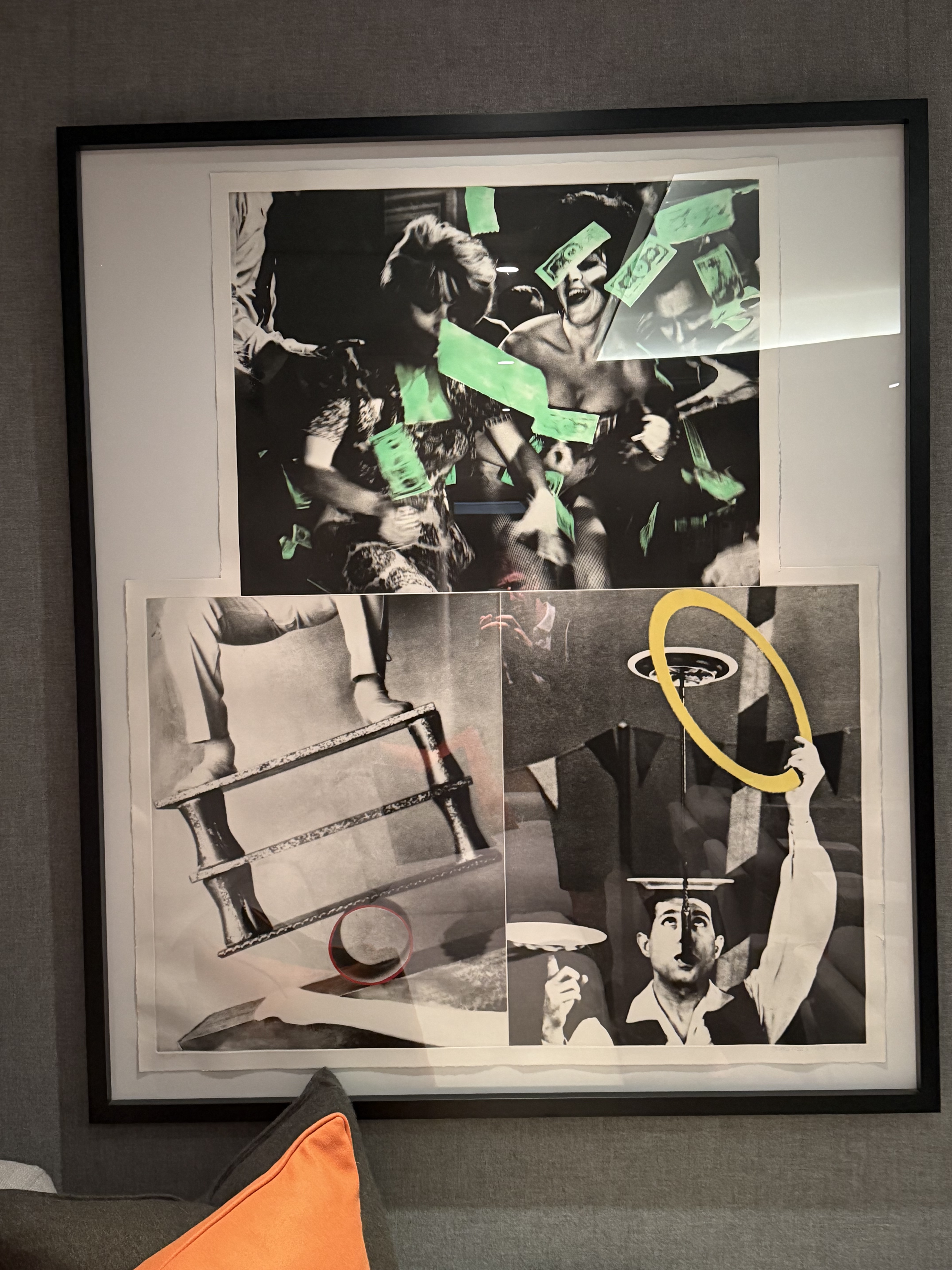 A landmark work by conceptual art pioneer John Baldessari, 'Life Balance with Money' (1989) is a photogravure with aquatint combining black-and-white found imagery with vivid hand-applied color accents — fluorescent green dollar bills cascade over revelers in the upper panel, while a red circle and gold halo ring punctuate a diptych of a balancing act below. The work exemplifies Baldessari's signature use of appropriated photography, juxtaposition, and colored dot/circle overlays to interrogate media, desire, and performance. Designated as a BAT (Bon à Tirer) proof, it holds a privileged position within the edition as the printer's reference impression. Signed and dated by the artist lower right: 'Baldessari 11-6-89.'