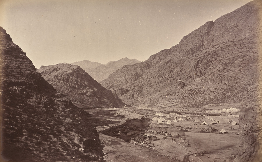 Juxtaposing ancient religious architecture with contemporary military encampment, Burke's photograph encapsulates the cultural layers of colonial occupation.