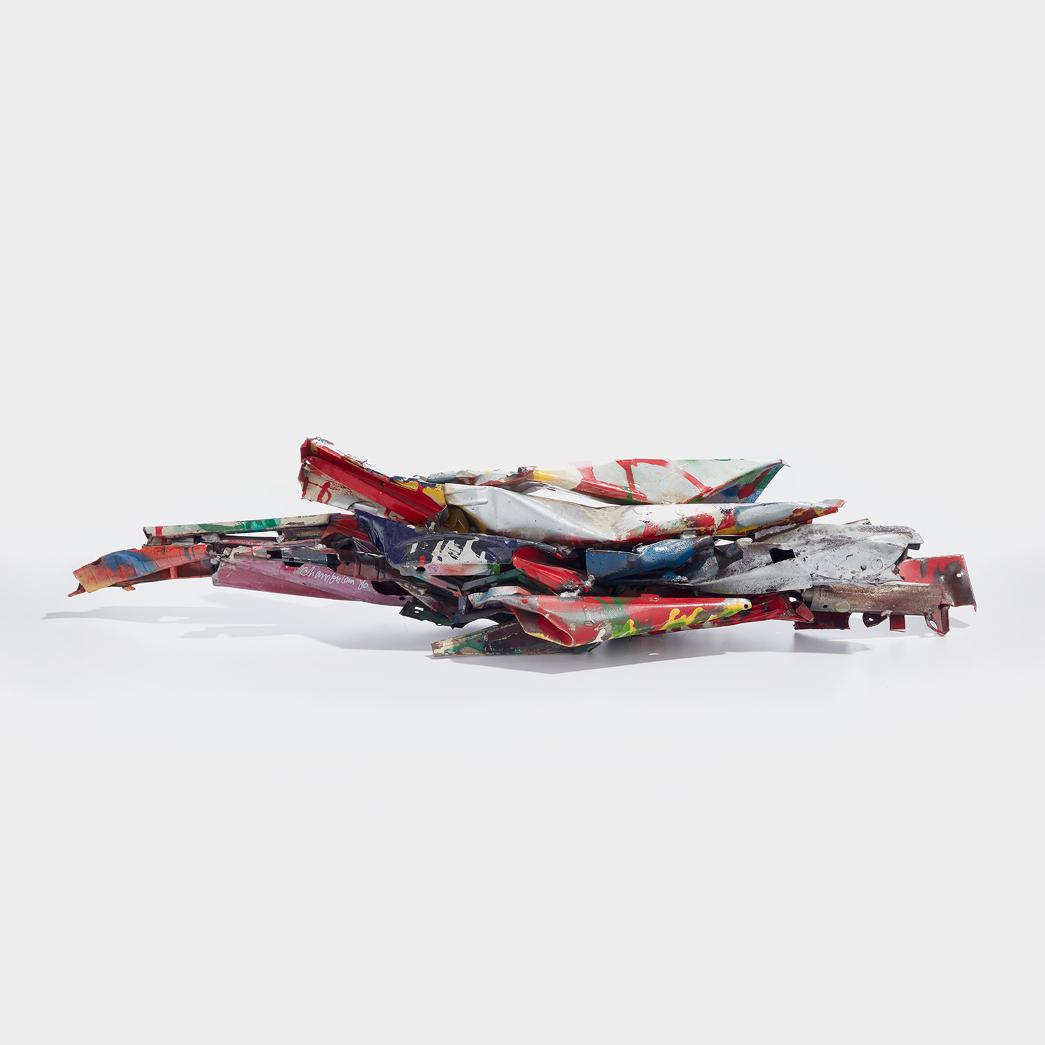 Tonk #8 is a dynamic sculpture by John Chamberlain created in 1986, composed of crushed and soldered metal fragments that have been painted in vivid, intertwining hues. The work exemplifies Chamberlain's signature practice of transforming industrial materials—often reclaimed automobile parts—into expressive abstract forms that evoke both tension and fluidity. The interplay of compressed metal surfaces and bold color creates a sense of frozen energy, inviting the viewer to consider the beauty found within destruction and reconstruction.