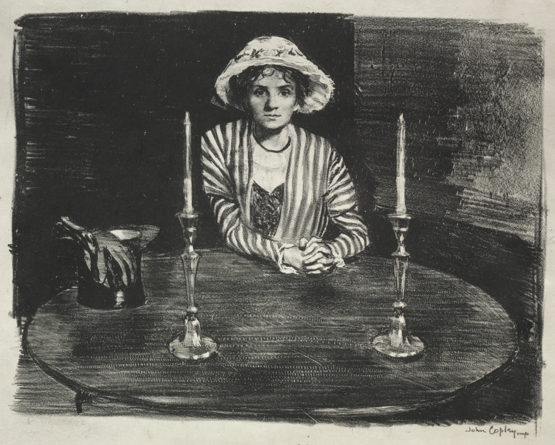 Quiet contemplation is rendered through careful attention to pose and setting in this lithographic study of solitary reflection.