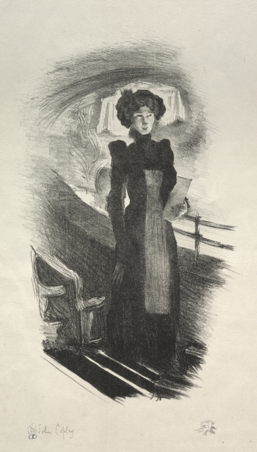 Street life and commerce intersect in this charming lithograph that celebrates the humble figures who facilitate urban cultural life.