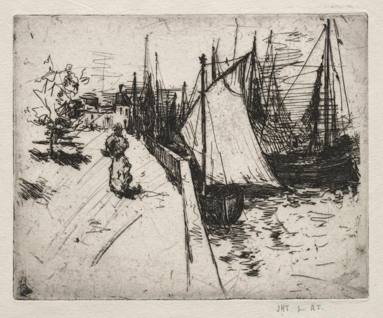 Set in the picturesque Norman port that attracted many American artists, the solitary figure demonstrates Twachtman's sensitivity to mood and his emerging Impressionist aesthetic.