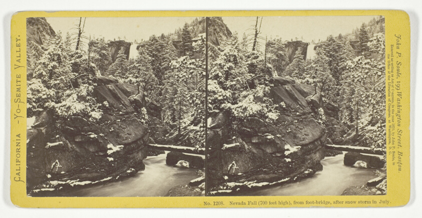 Documenting the dramatic weather patterns of the Sierra Nevada, this stereocard captures the unusual sight of July snow in Yosemite Valley. The albumen print's tonal range effectively renders both the delicate snow formations and the powerful cascade of Nevada Fall.