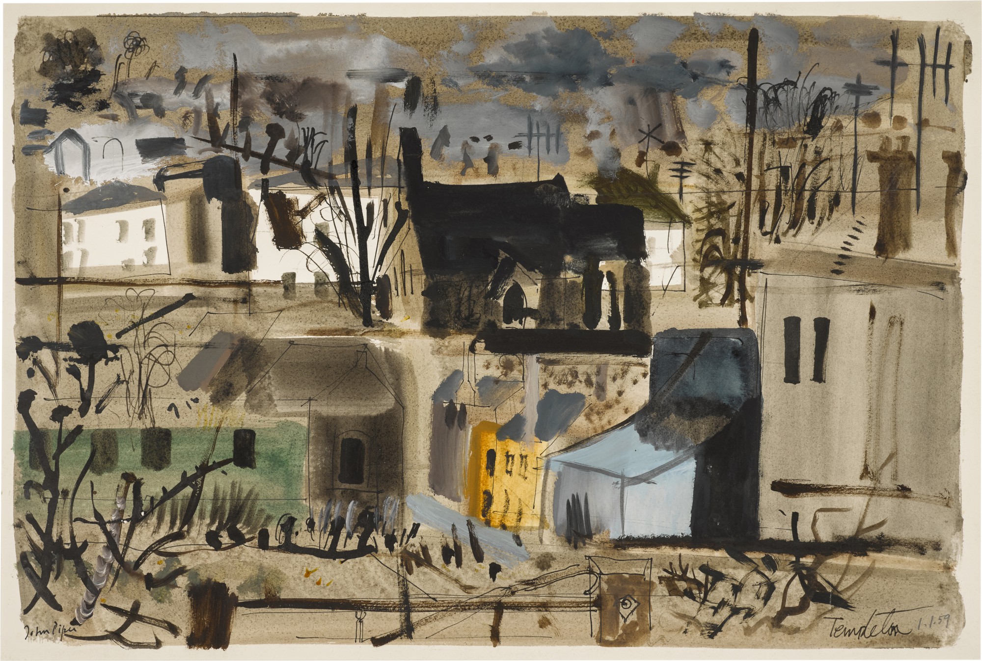 John Piper's 1959 'Templeton' combines gouache, watercolor, ink, and pencil to capture the architectural character of a historic structure. The mixed media approach reflects Piper's distinctive approach to depicting Britain's architectural heritage.