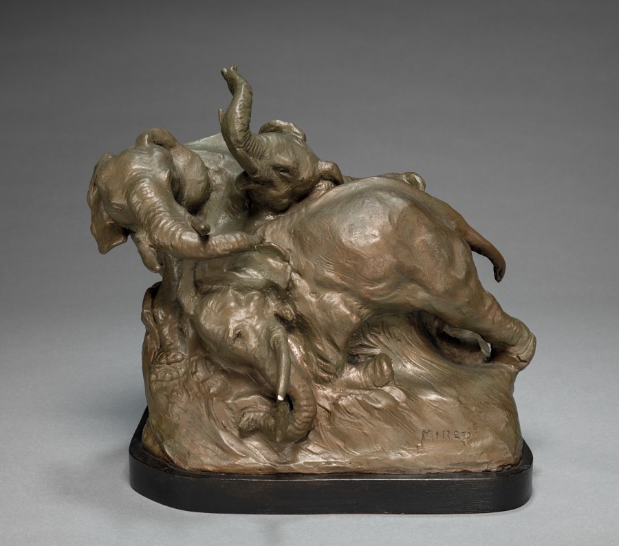 Painted plaster mimics the green patina of aged bronze in this early 20th-century sculpture that demonstrates the period's fascination with alternative materials and finishes.