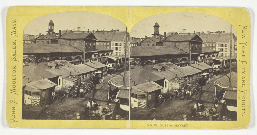 Moulton's stereoscopic albumen print transforms a bustling New York market into an immersive three-dimensional experience, showcasing the popularity of stereo photography in 19th-century America.