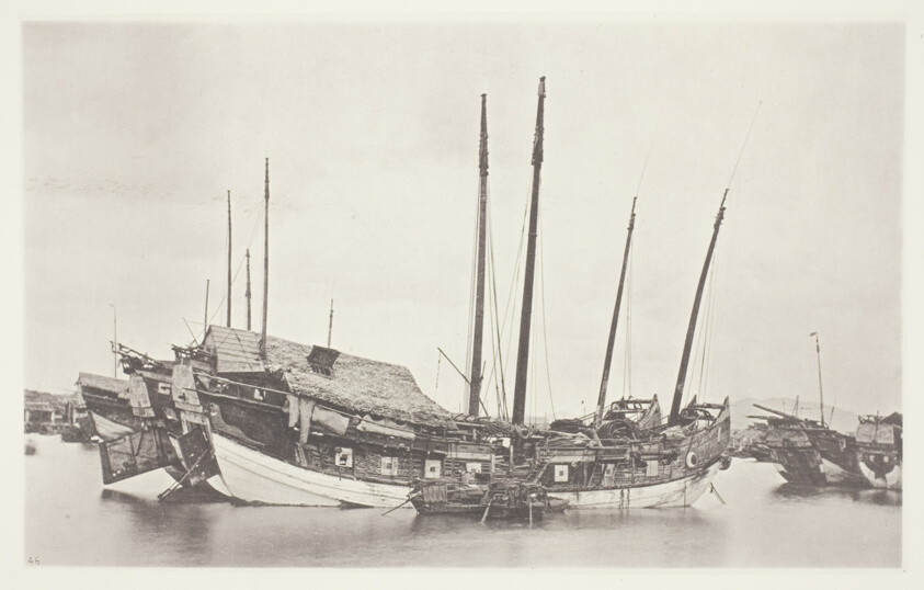 Traditional Chinese vessels represent centuries-old maritime technology and design, contrasting with the modern steamships beginning to dominate Asian waterways.