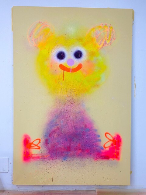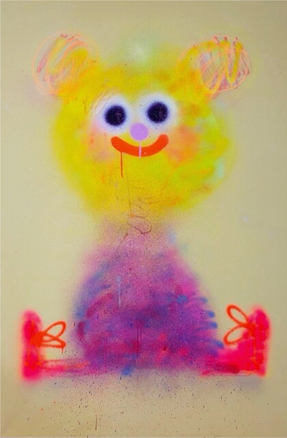 Hobnob is a vibrant mixed media work created by Jon Burgerman in 2022 using aerosol and oil bar on canvas. The piece combines the bold, immediate qualities of spray paint with the expressive potential of oil bars to create dynamic compositions. This work exemplifies Burgerman's playful approach to contemporary street art and fine art practice. The combination of materials creates layered textures and visual interest across the canvas surface.