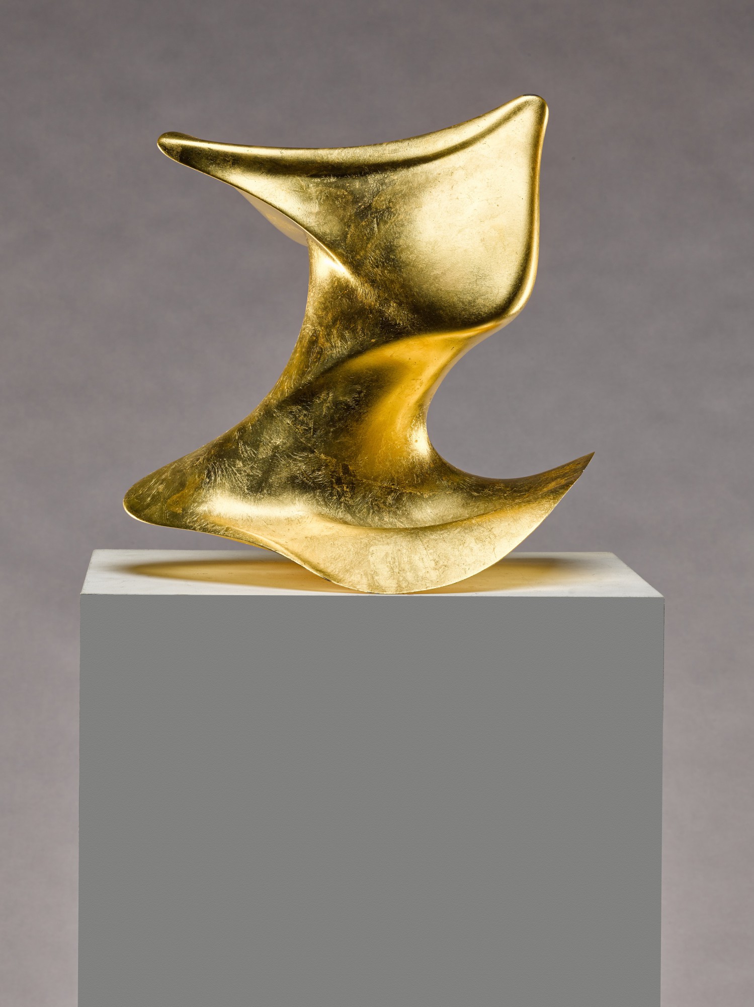 A contemporary mixed-media sculpture combining photopolymer resin, acrylic paint, and gold leaf to create a dynamic, decorative artwork. The piece exemplifies modern artistic experimentation with unconventional materials.