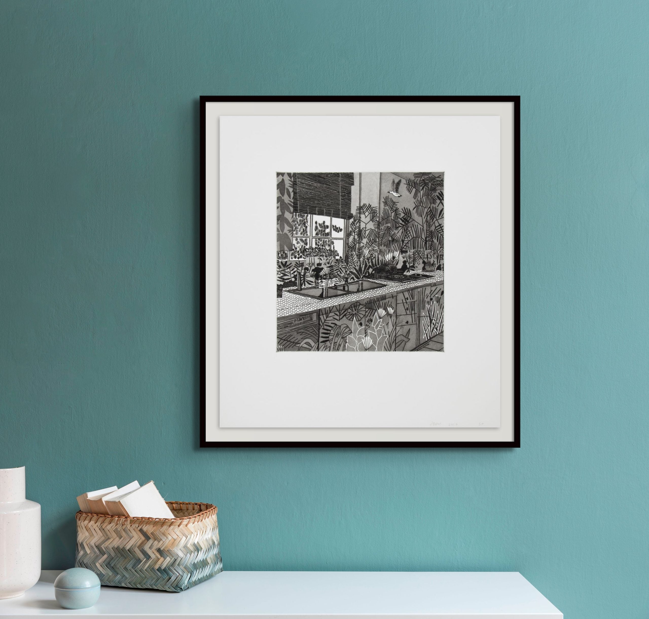 Jonas Wood ’s Jungle Kitchen (2017) is considered one of the artist’s most masterful limited edition prints, showcasing his ability to merge domestic interiors with the vibrancy of nature. This signed etching and aquatint print depicts a kitchen scene overflowing with lush tropical plants, where everyday objects and kitchen appliances stand in contrast to bold organic forms. The dynamic interplay between interior and exterior spaces reflects Wood’s ongoing exploration of pattern, texture, and balance. This edition was limited to only 30 prints, with the present work being a unique Special Proof print (SP), hand-signed and dated by the artist. Published by WKS Editions in Los Angeles, Jungle Kitchen highlights Jonas Wood’s playful yet reflective engagement with the intersection of home life and nature, inviting viewers to experience both order and wildness within a single, richly detailed composition.