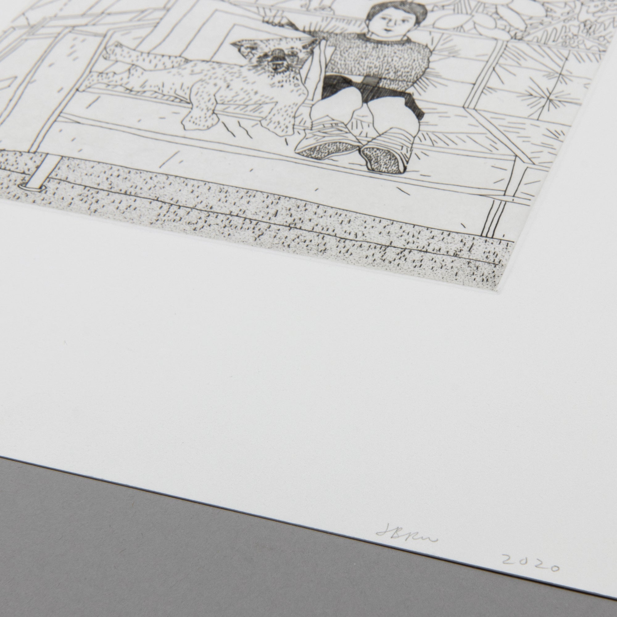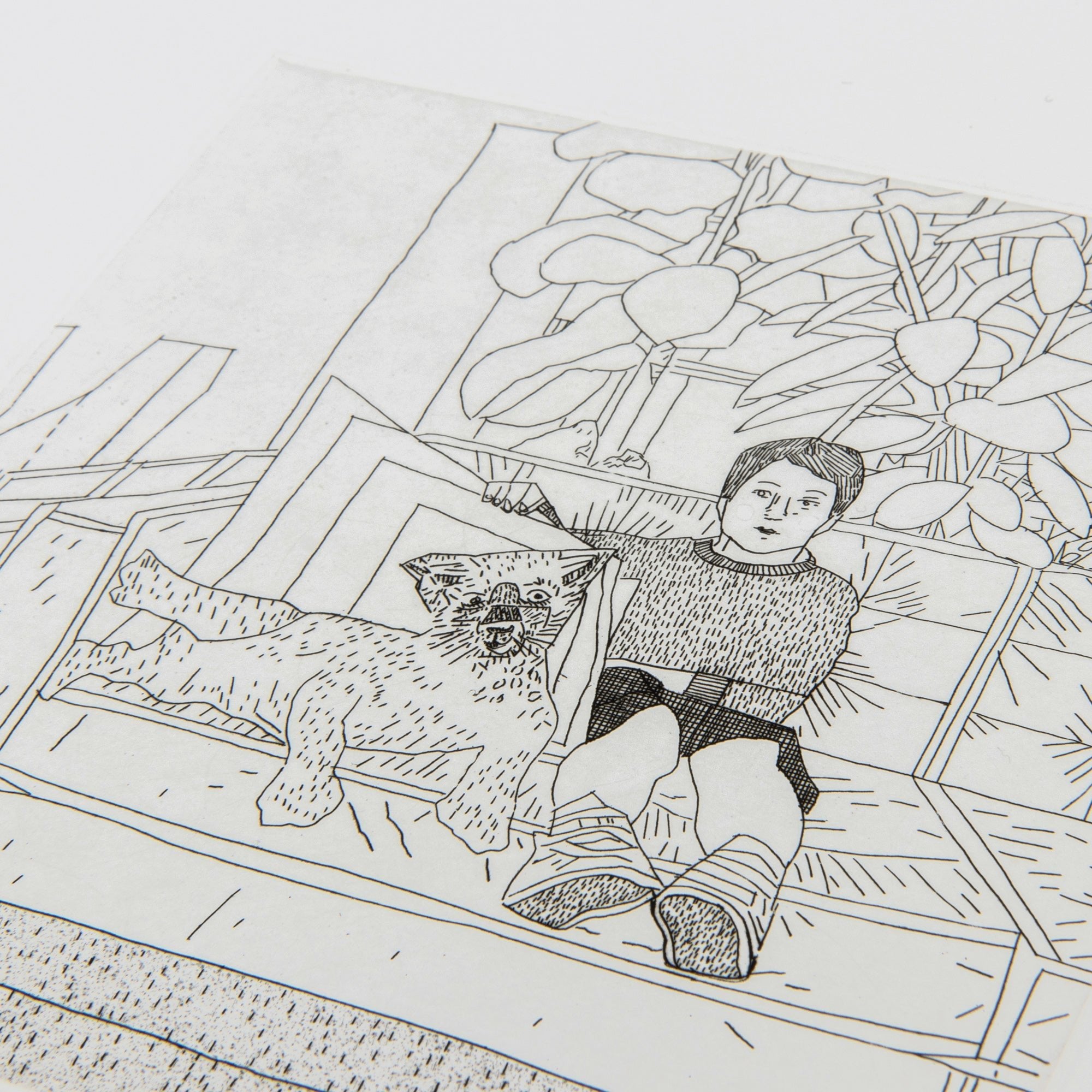 Jonas Wood 's Kiki and Leopard (State II) is an intimate limited edition etching and drypoint print from 2020 depicting a quiet domestic moment drawn from the artist's personal life. The fine art print shows Wood and Shio Kusaka's son, Kiki, seated on a patterned couch beside a reclining leopard, an image that subtly blurs the line between everyday reality and imagined presence. Rendered with delicate linear precision and enriched through the use of chine-collé, the signed artwork reflects Wood's longstanding interest in interiors, family life, and the translation of lived experience into carefully constructed imagery. The juxtaposition of the child and the animal introduces a gentle surrealism, while the restrained palette and meticulous mark-making emphasize intimacy, stillness, and observation. Produced in an exceptionally rare edition of just 12 prints, with an additional 4 artist's proofs , Kiki and Leopard (State II) is hand-signed and numbered by the artist, exemplifying Jonas Wood's sensitivity to memory, portraiture, and personal space.