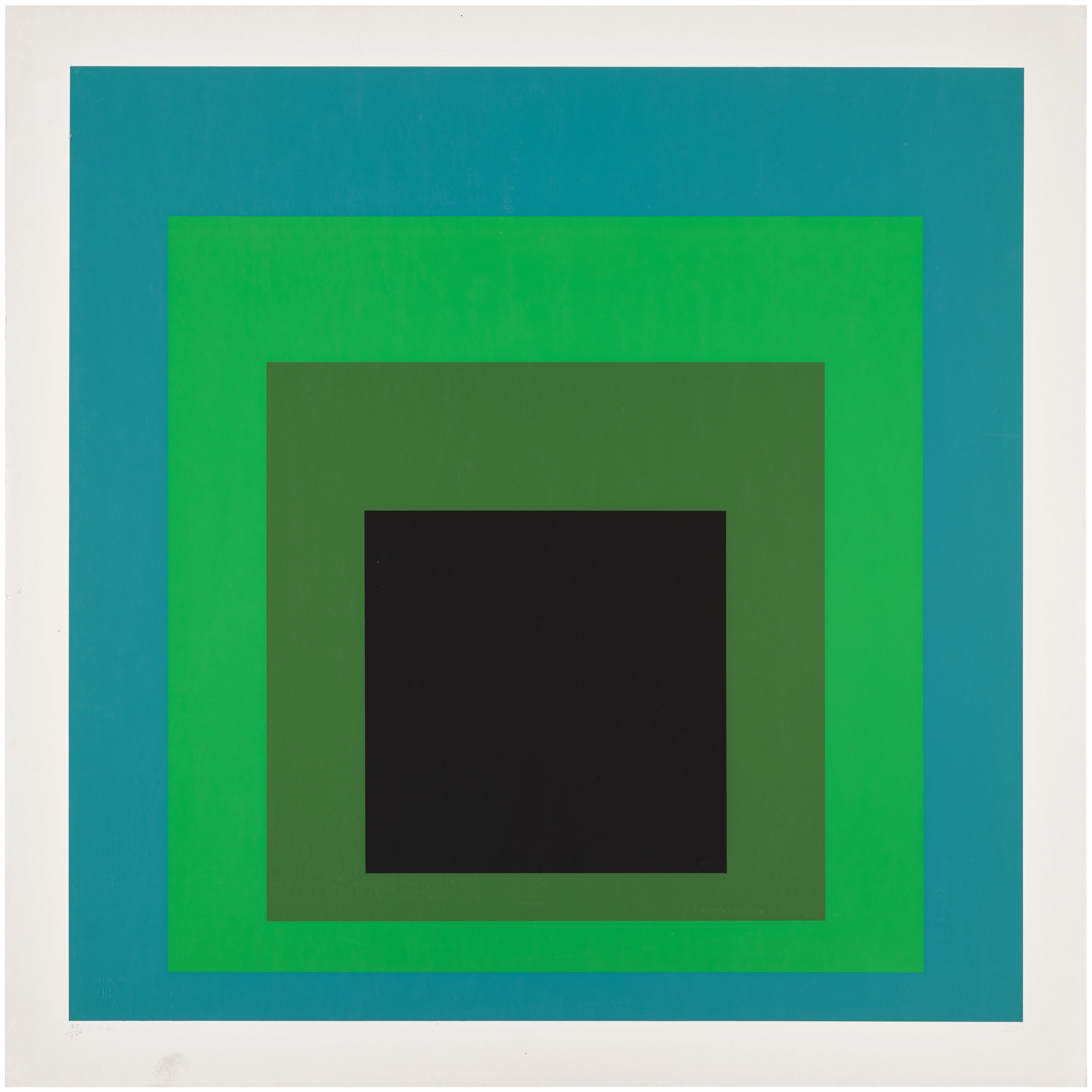 A masterful exploration of color interaction and geometric precision, this screenprint exemplifies Josef Albers' lifelong investigation into the optical and perceptual effects of color relationships. Bold, concentric squares or rectangular forms are rendered in flat, carefully chosen hues that appear to shift and vibrate against one another, challenging the viewer's perception of depth and spatial harmony. Executed on heavy board with full margins, the work reflects Albers' rigorous and methodical approach to understanding how colors influence and transform one another when placed in proximity.