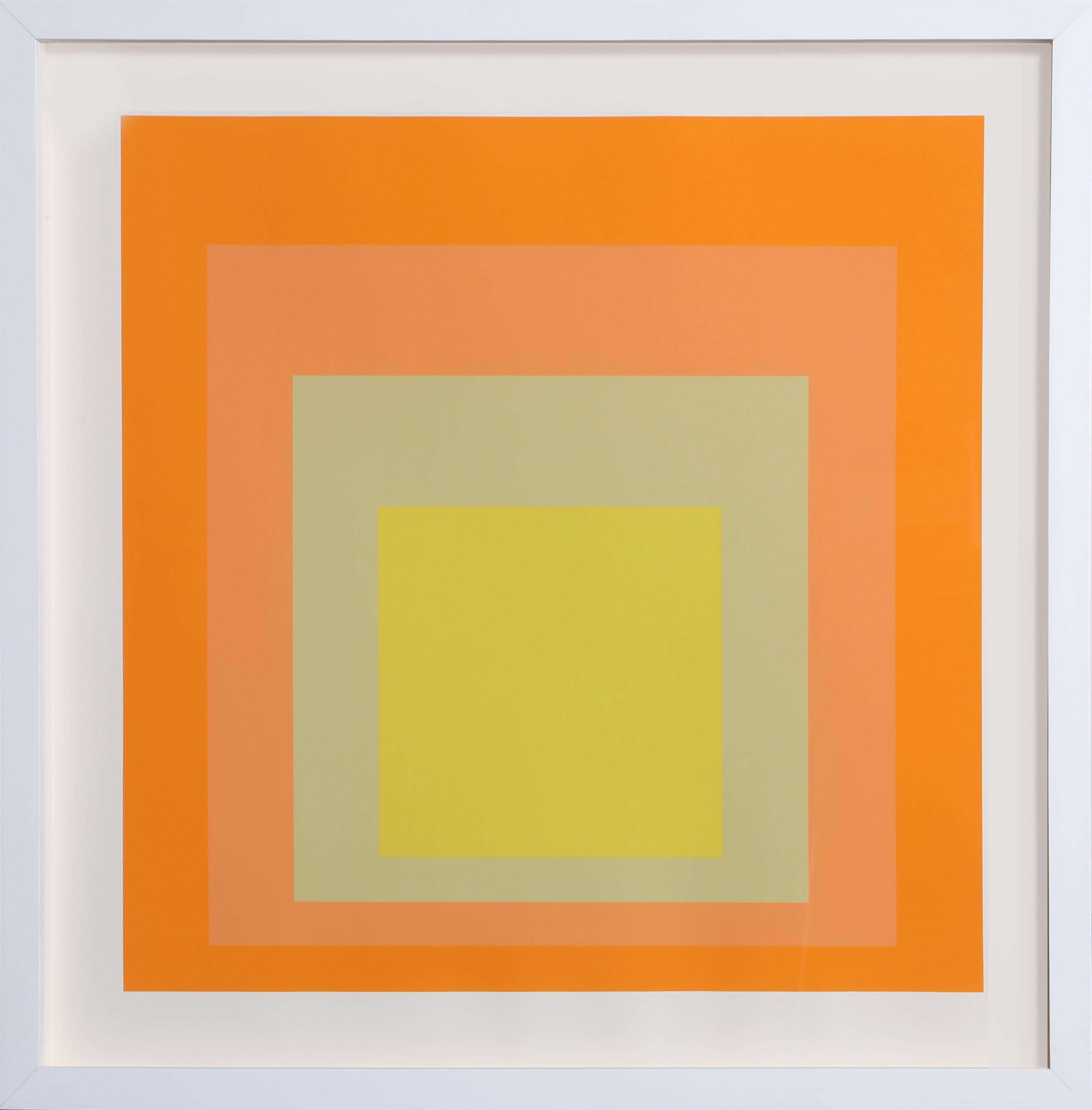 In this screenprint, Josef Albers presents nested squares of carefully calibrated colors that interact and vibrate against one another, demonstrating his theory that color perception is relative and dependent on surrounding hues. The work exemplifies Albers' systematic exploration of how colors optically advance and recede based on their relationships, a central concern of his extensive "Homage to the Square" series begun in 1949. Through the precision of screenprinting, Albers reveals how identical colors can appear dramatically different when placed in different chromatic contexts, inviting viewers to experience color as a dynamic perceptual phenomenon rather than a fixed property.