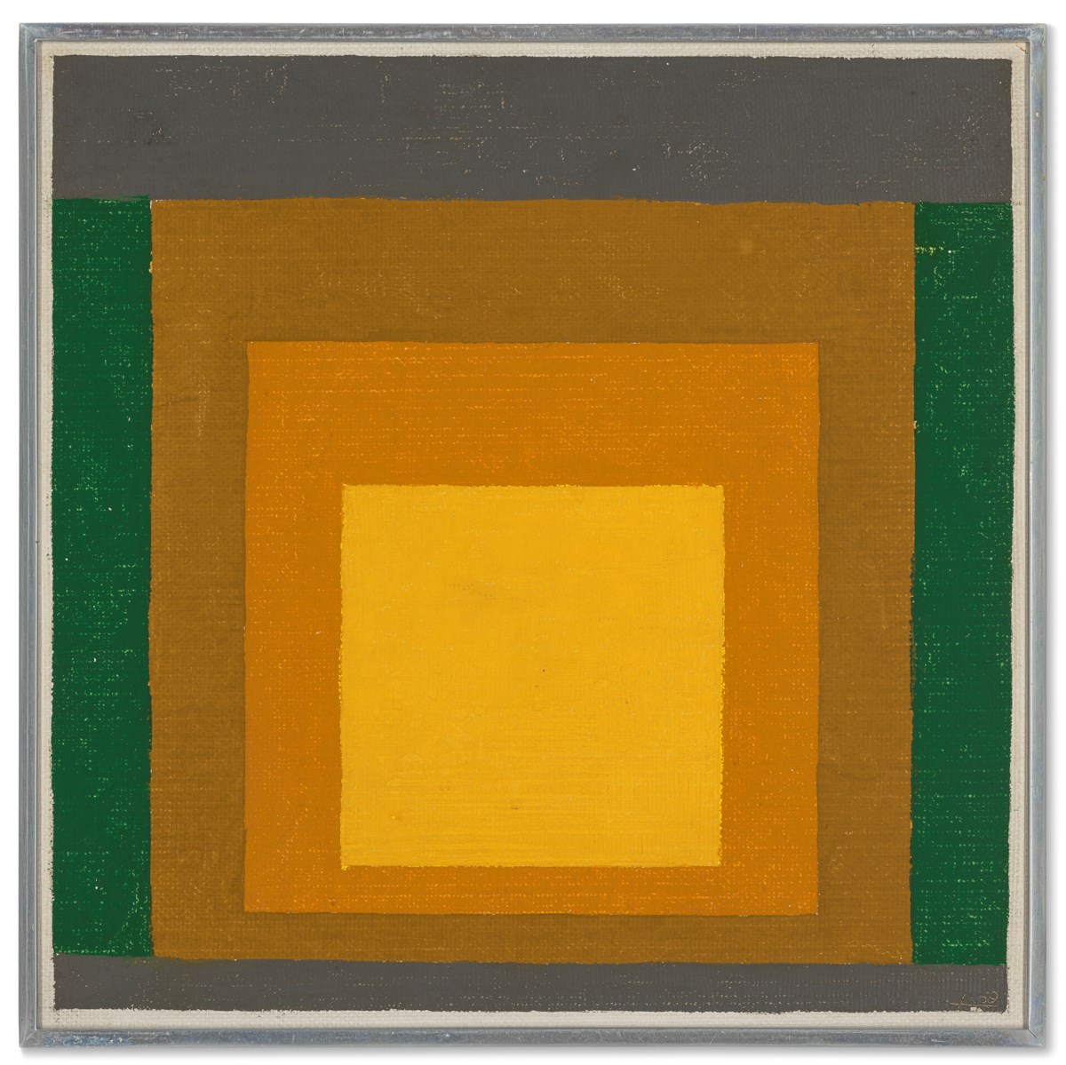 Josef Albers' "Study to Homage to the Square: 3 Yellows with green and grey" exemplifies his lifelong investigation into the dynamic relationships between colors through the use of concentric, nested squares. Rendered in oil on Masonite, the composition features three yellow tones alongside green and grey, demonstrating how adjacent hues can appear to shift and transform one another through perception. This work reflects Albers' foundational belief that color is never absolute, but rather constantly influenced by its surrounding context.