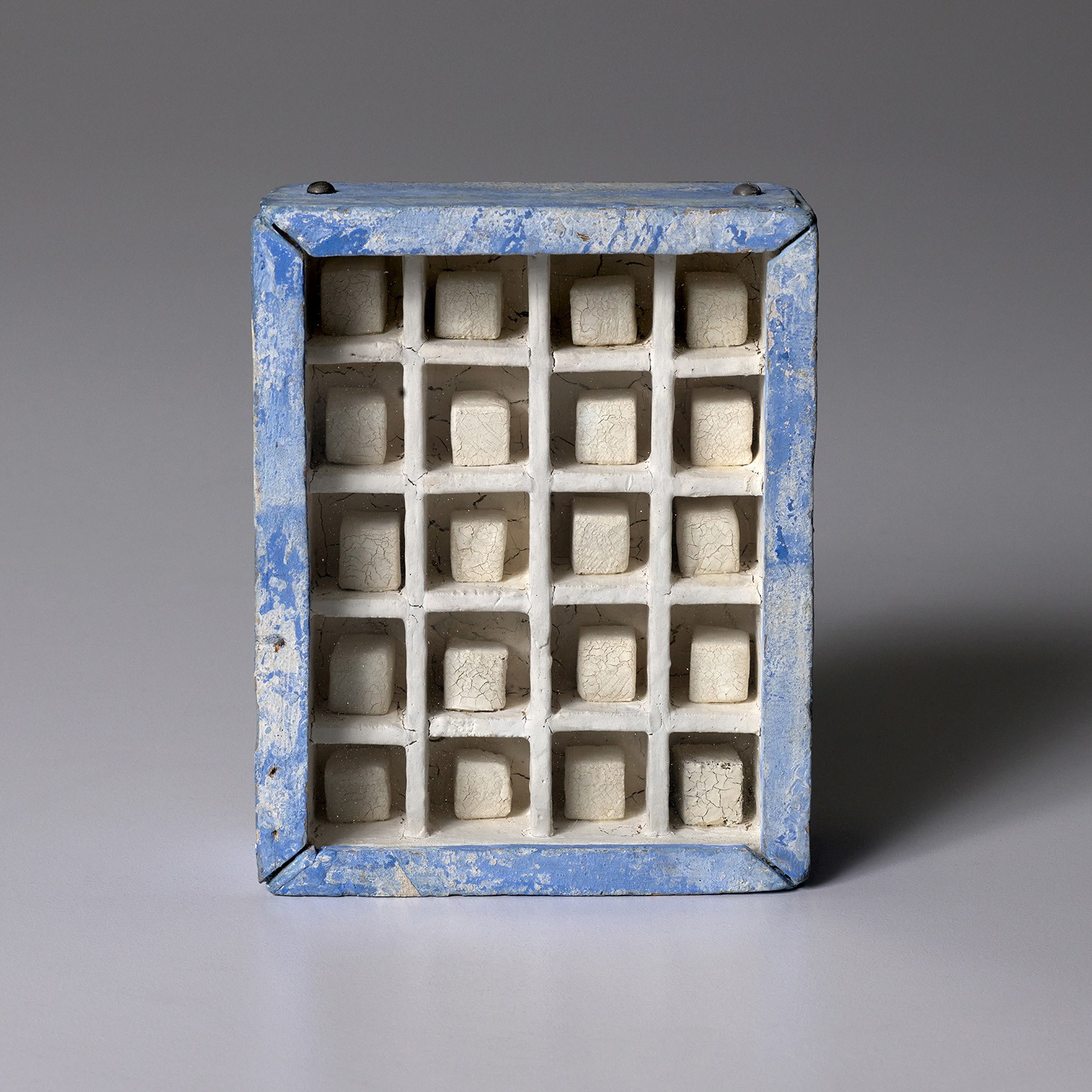 - mixed media in glass-faced wooden box construction (with printed paper collage on the reverse)