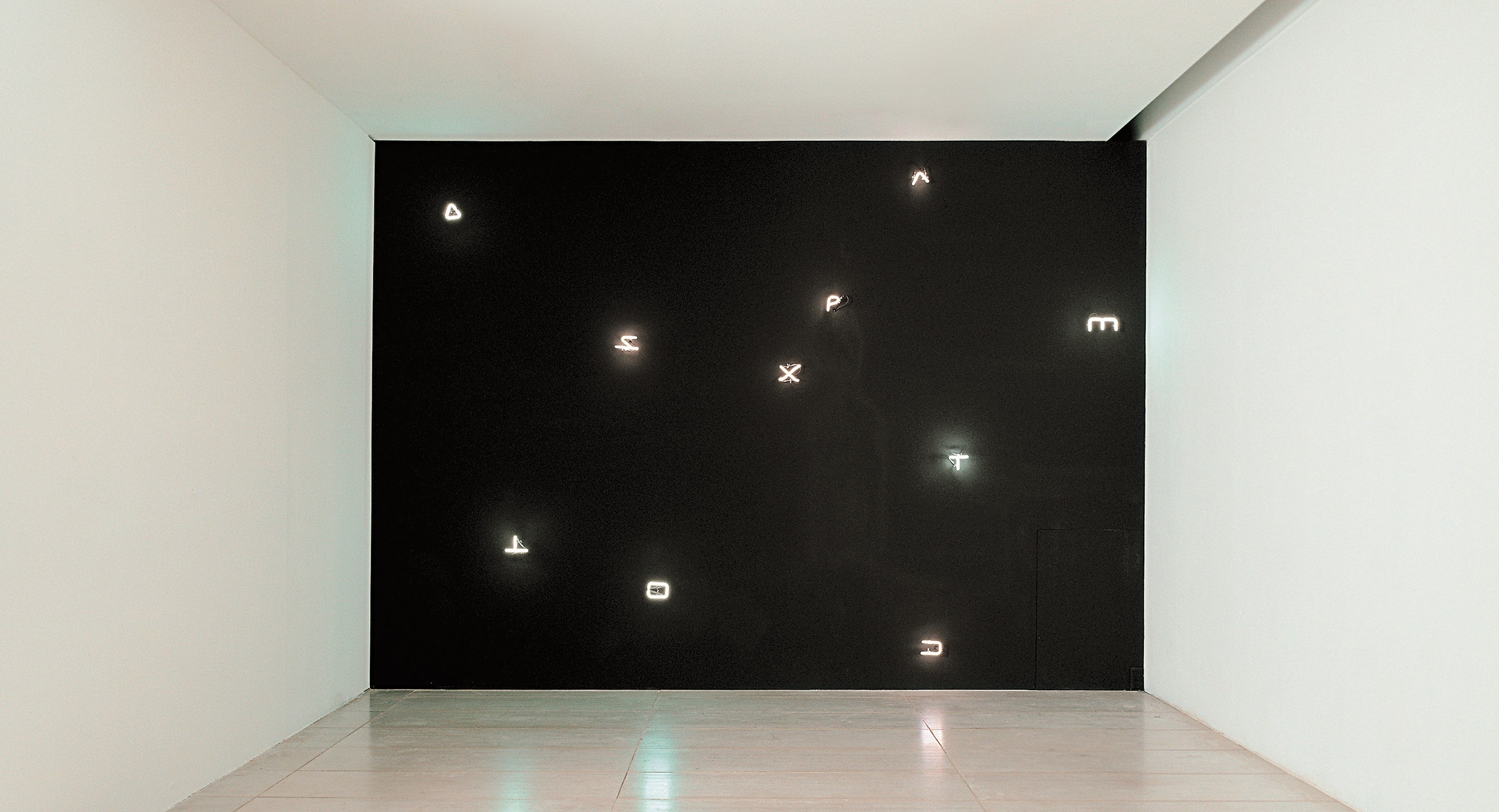 Joseph Kosuth's 'Sigla, Finnegans Wake, from Wall Works' is a conceptual installation using ten letter-shaped warm white fluorescent lights mounted on a matte-satin black painted wall. The work references James Joyce's literary text through linguistic and visual means.