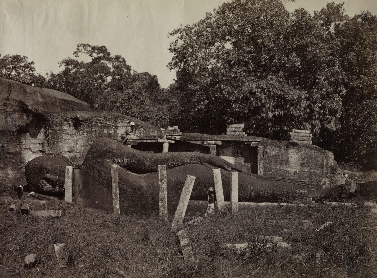 An early albumen print documenting the massive reclining Buddha sculpture at Gal Vihara, showcasing 19th-century colonial photography's role in recording Ceylon's ancient Buddhist heritage.