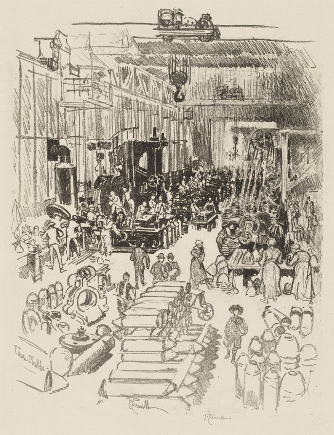 Precision manufacturing processes become studies in light, form, and human labor in this carefully observed wartime industrial scene.