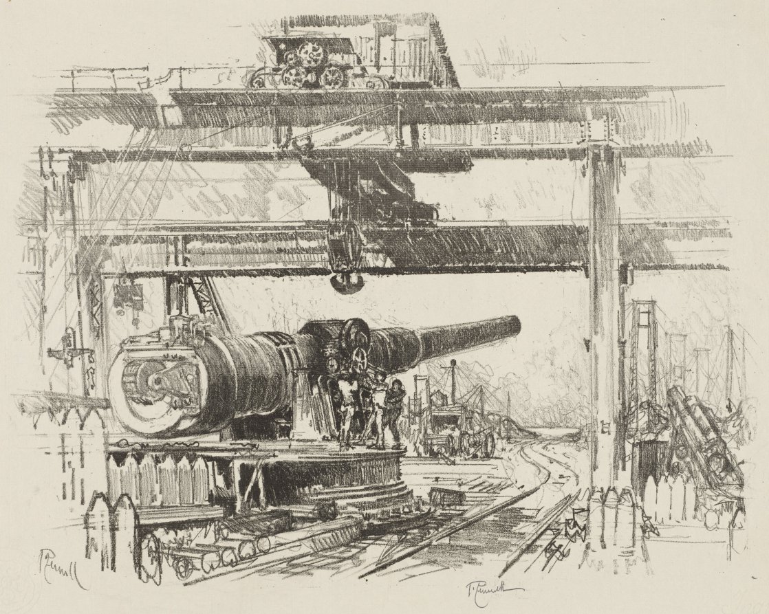 Explosive energy radiates from Pennell's depiction of weapons testing, where lithographic technique perfectly captures the smoke, fire, and industrial chaos of war preparation.