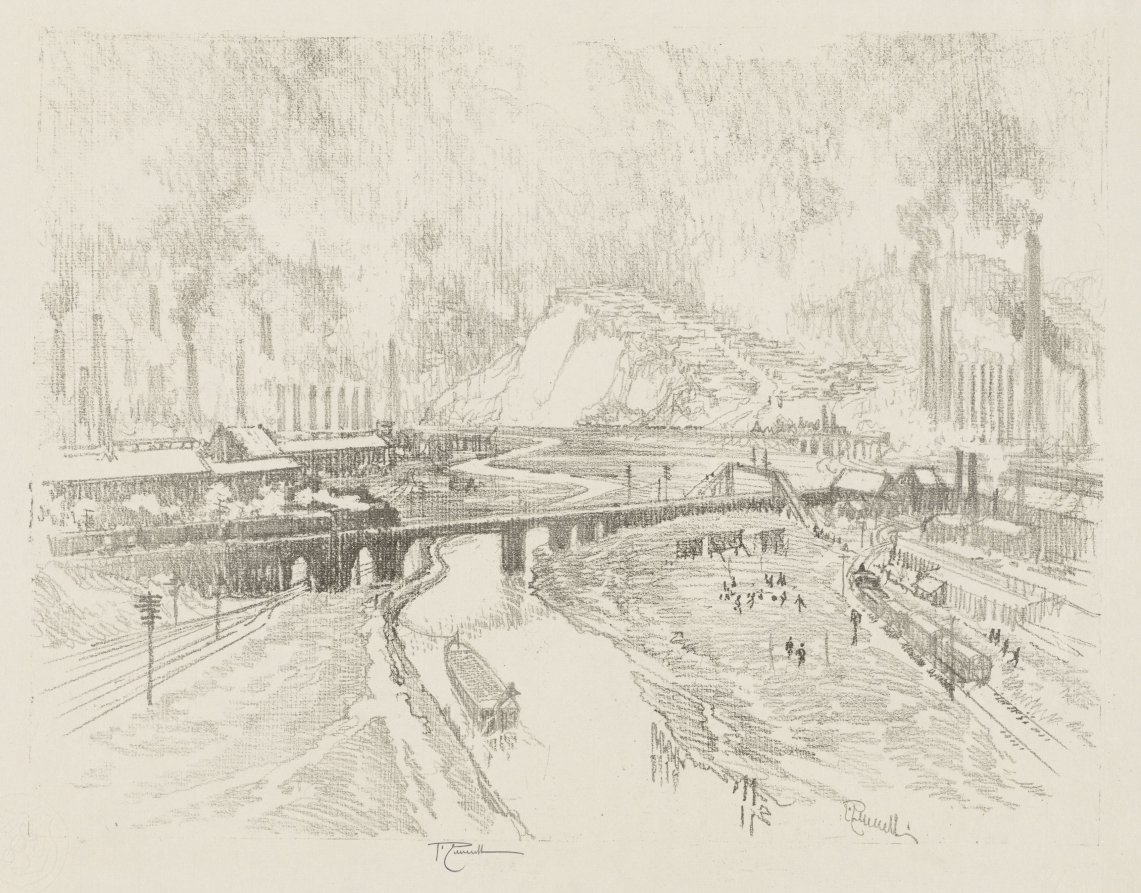 Urban transformation under wartime pressures becomes the subject of this lithograph, where Pennell's compositional skills turn industrial sprawl into compelling visual narrative.