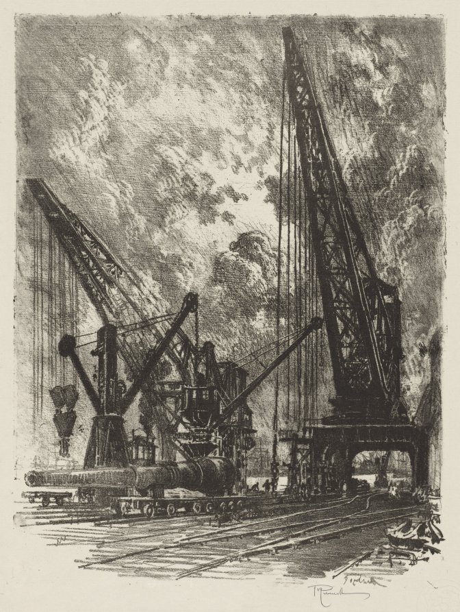 Dynamic diagonal composition and bold tonal contrasts emphasize the monumental scale of artillery transport in Pennell's powerful wartime documentation.