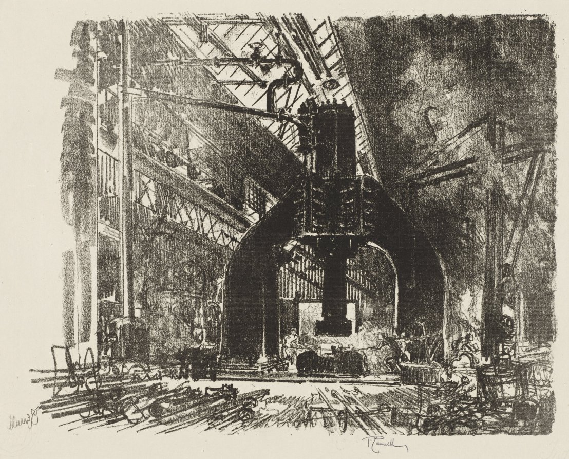 Pennell's dramatic lithographic technique captures the raw power and scale of British industrial machinery, creating an almost mythic vision of wartime production.
