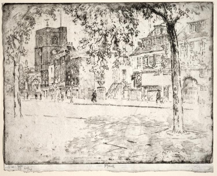 Created as a memorial tribute, this intimate etching demonstrates Pennell's skill in architectural portraiture while honoring his friendship with the influential American expatriate artist.