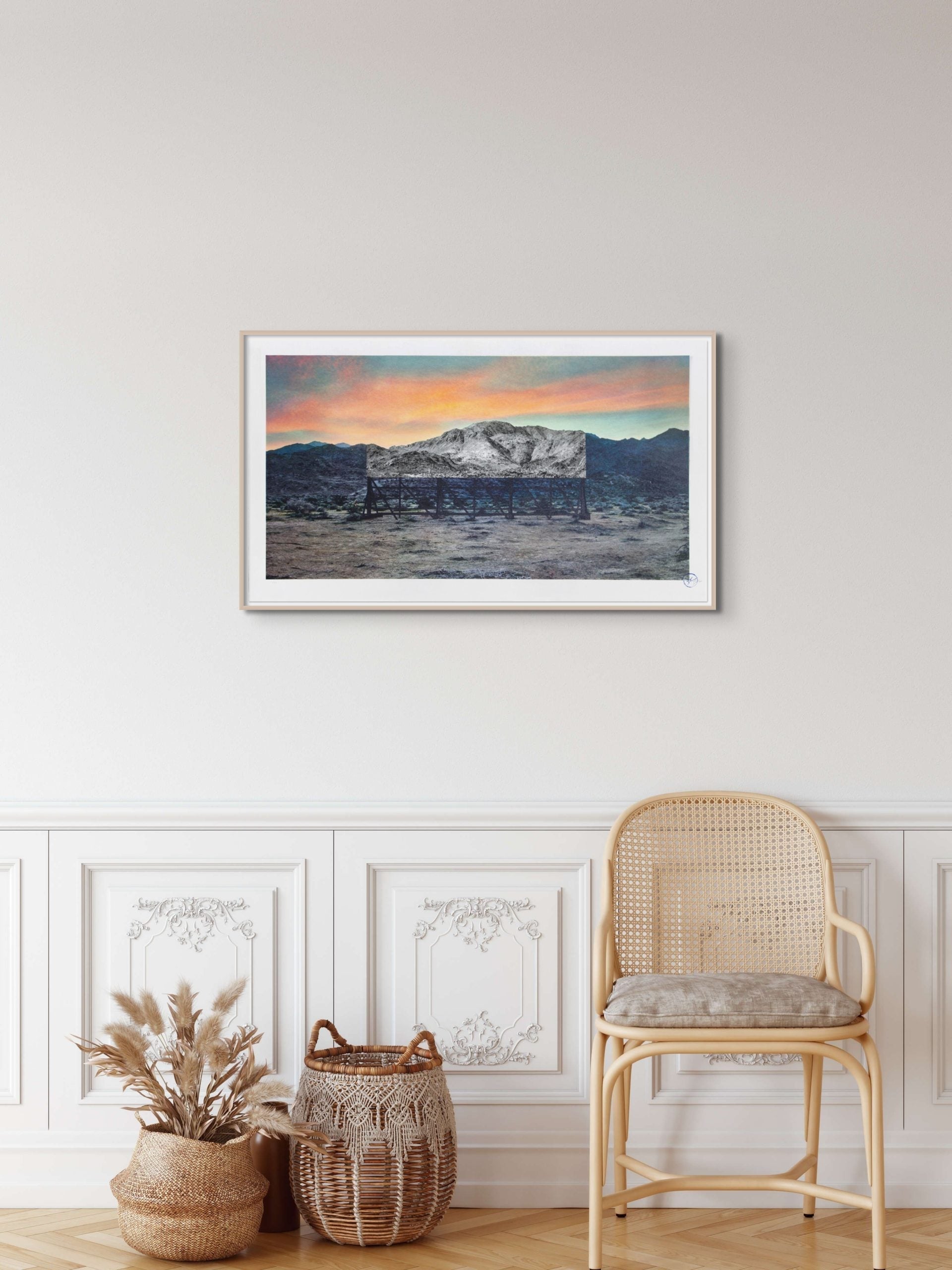 JR's Trompe l'Oeil, Death Valley, Billboard originates from the artist's ongoing Trompe l'Oeil series, in which large-scale photographic interventions are installed directly into landscapes to disrupt perception and spatial logic. Installed in the California desert in 2017, the signed lithograph presents a billboard whose image aligns precisely with the surrounding mountain range, creating a striking illusion in which representation and reality momentarily collapse into one another. By inserting a photographic fragment of the landscape back into the landscape itself, JR questions the authority of images, the mechanics of visual truth, and the constructed nature of what we see. The billboard structure, typically associated with advertising and mediation, becomes a tool for reflection rather than persuasion, drawing attention to how images frame, isolate, and reshape our experience of place. Published in 2017 in a limited edition of 100 lithographs, Trompe l'Oeil, Death Valley, Billboard is hand-signed and numbered by the artist. This fine art print translates the ephemeral site-specific intervention into a permanent, collectible format while preserving the conceptual rigor of the original artwork, exemplifying JR's practice of merging photography, public space, and illusion to challenge conventions of representation and scale.