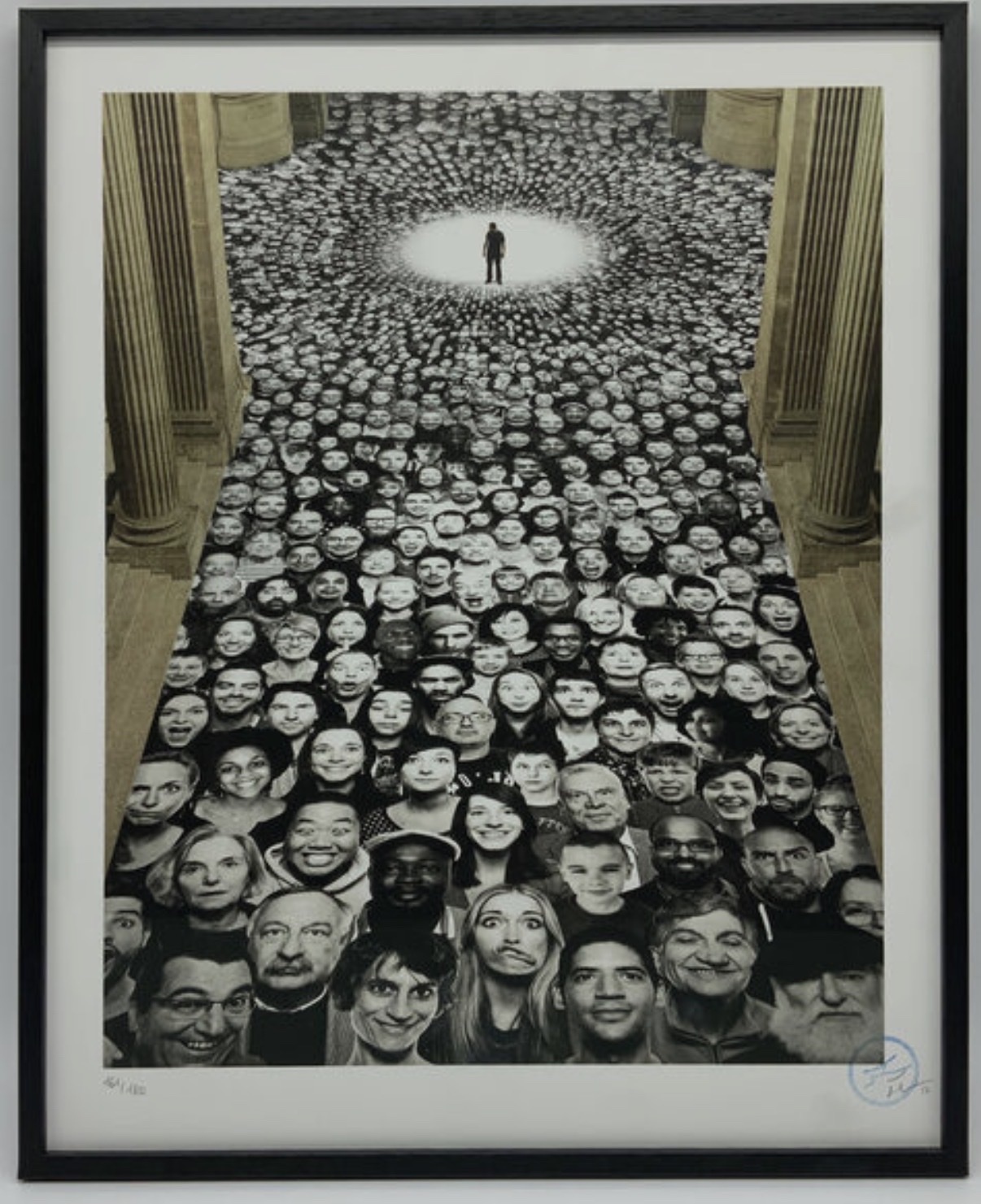 A striking large-format lithograph by the French street artist JR, depicting a solitary figure standing at the vanishing point of a vast crowd of faces that carpet the grand interior of the Panthéon in Paris. The composition creates a powerful optical illusion, with hundreds of photographed faces radiating outward from a central glowing light source, rendered in dramatic black-and-white tones. This work was part of the 2018 portfolio 'Reporter Sans Frontières – 100 photos pour la liberté de la presse' and is numbered lower left, with the artist's stamp, date, and signature lower right, printed on the Idem Paris press with their blind stamp. The edition of only 180 makes this a highly collectible example of JR's signature participatory and monumental photographic practice.