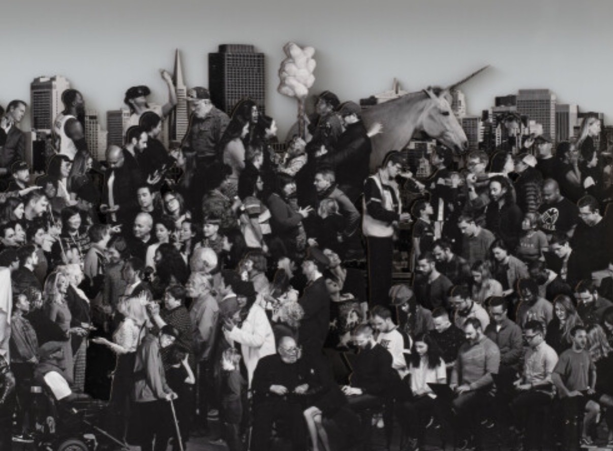 A monumental triptych by the French street artist JR, depicting a sweeping black-and-white panorama of San Francisco's diverse population — protesters, performers, readers, and passersby — composited into a dense, cinematic collage evoking the full spectrum of urban life. Each of the three horizontal panels measures 43 × 200 × 7 cm, assembling into a combined installation width of 600 cm. The work is a unique piece (not an edition), presented in black metal frames with plexiglass. Currently located in Los Angeles, USA, with shipping available by request through Galerie Perrotin.