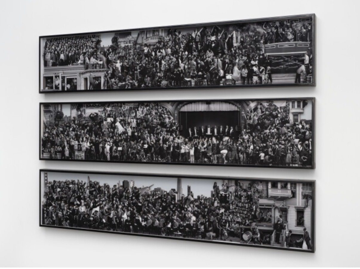 Triptych of 3 panels, each measuring 43 × 200 × 7 cm (16 15/16 × 78 3/4 × 2 3/4 inches). Installed total: 43 × 600 × 7 cm (16 15/16 × 236 1/4 × 2 3/4 inches). Unique work — not an edition. Current location: Los Angeles, USA. Shipping details available by request. Listed on Galerie Perrotin's leaflet platform (leaflet.perrotin.com). Detail photo reveals protest signs including 'Vote for a Fur-Free San Francisco – PETA', newspaper stands with 'The New York Times' and 'RESIST', and signage reading 'PEACE IS POSSIBLE'. The Castro Theatre marquee is visible in the panorama. Work references multiple eras and social movements in San Francisco.