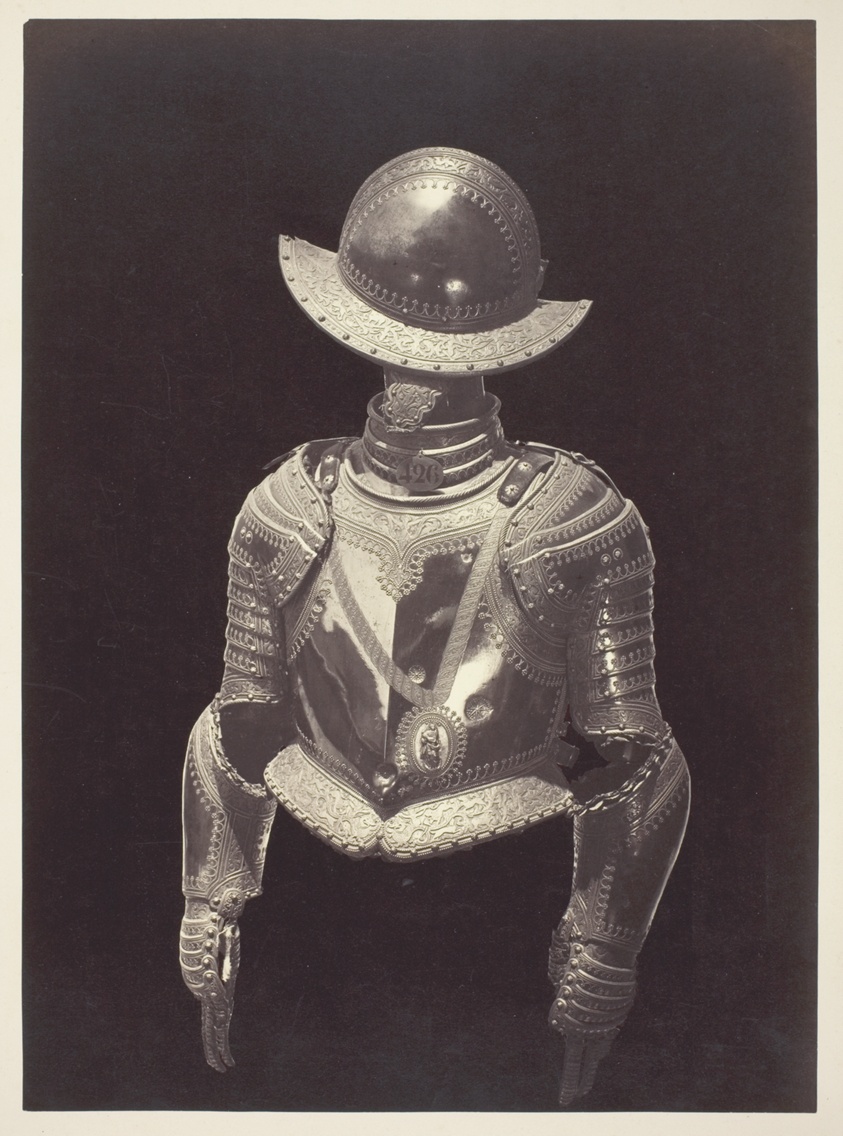 Documentary photograph preserves the elaborate ceremonial armor of the Spanish Habsburg monarch, serving as both artistic study and invaluable historical record of royal regalia.