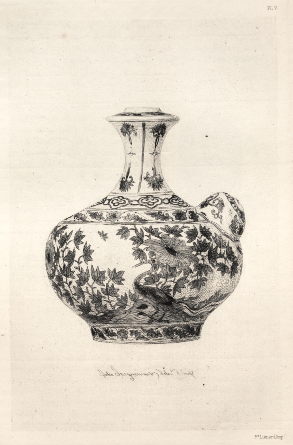 This etching by Jules Jacquemart documents a Persian soft porcelain gargoulette, a spouted water vessel, adorned with imagery of the Simorg, a legendary bird figure from Persian mythology and Islamic art traditions. The work functions as an illustration within Jacquemart's comprehensive study of ceramic history across cultures and periods, demonstrating his scholarly approach to cataloging decorative arts techniques and iconographic traditions. The etching medium allows Jacquemart to render fine details of the vessel's form and the intricate mythological decoration with precision suitable for art historical documentation.