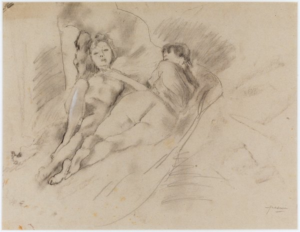 Paired female figures exemplify Pascin's fascination with feminine companionship and his skill at rendering psychological connections between subjects through subtle gestures and positioning.