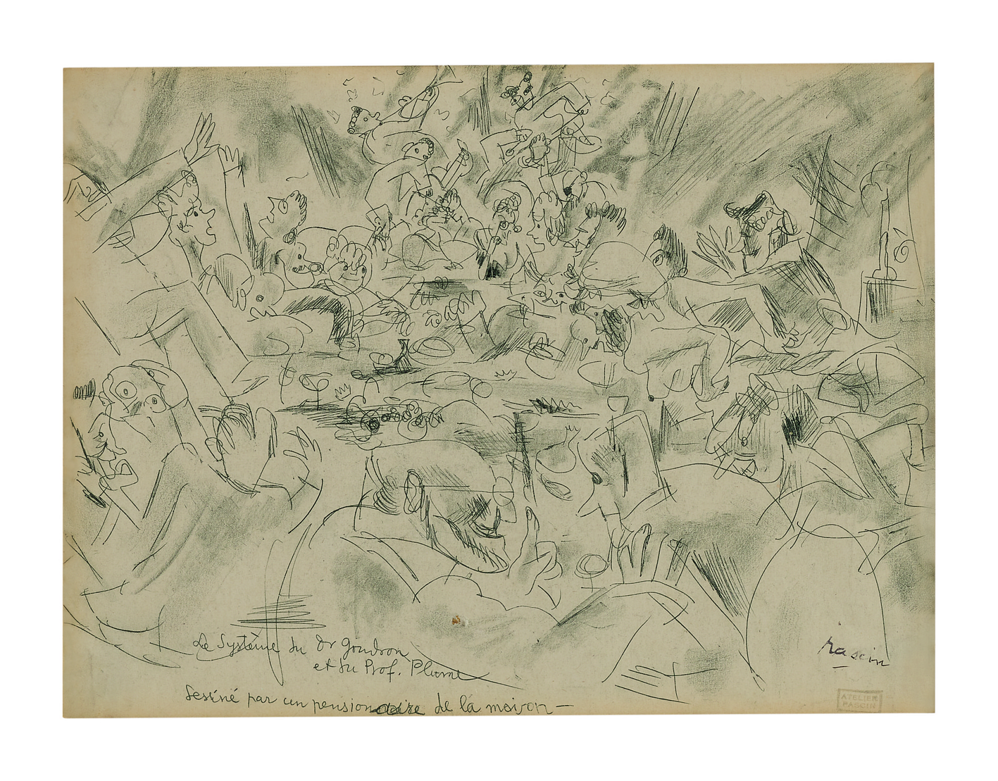 A lively scene rendered in Pascin's characteristic loose, fluid line work, capturing the intimate atmosphere of a social club with figures gathered in casual conversation and leisure. The combination of pen and ink with pencil creates a layered sense of depth and spontaneity, reflecting the artist's keen eye for Bohemian nightlife and human interaction. Pascin's gestural draftsmanship brings warmth and movement to the composition, evoking the transient, atmospheric energy of Parisian café culture.