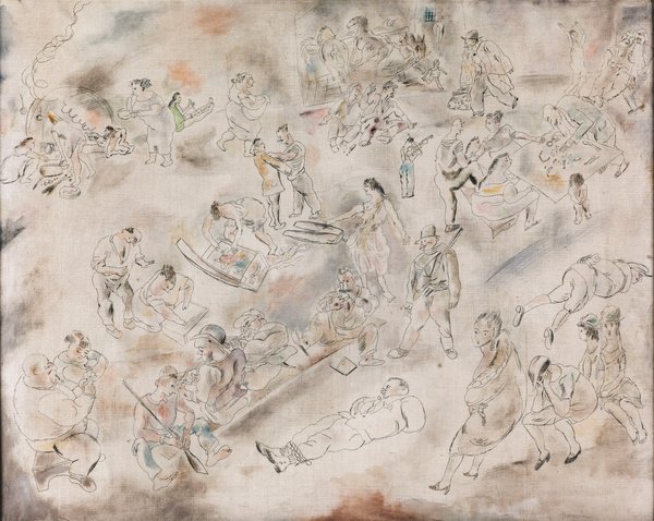 Watercolor's transparency creates atmospheric effects around loosely defined figures, showcasing Pascin's versatility across different drawing and painting media.