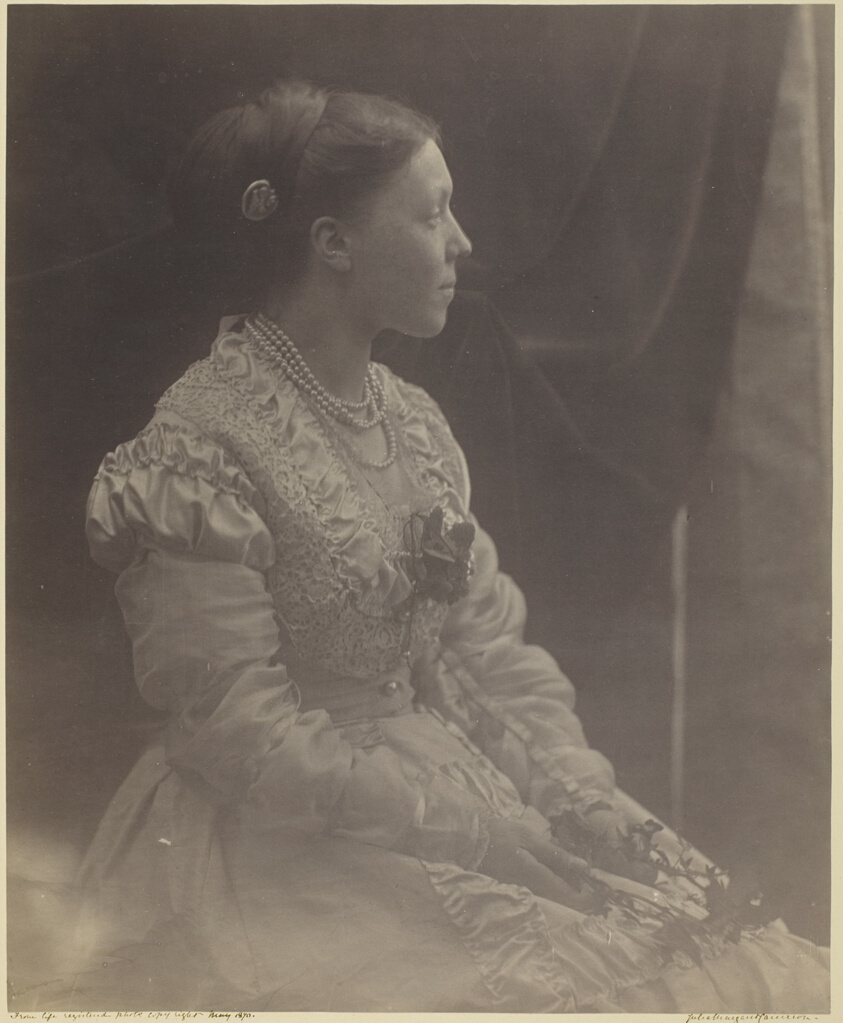William Makepeace Thackeray's daughter poses for Cameron's lens in this striking portrait that exemplifies the photographer's skill at capturing the intellectual women of her Victorian circle.
