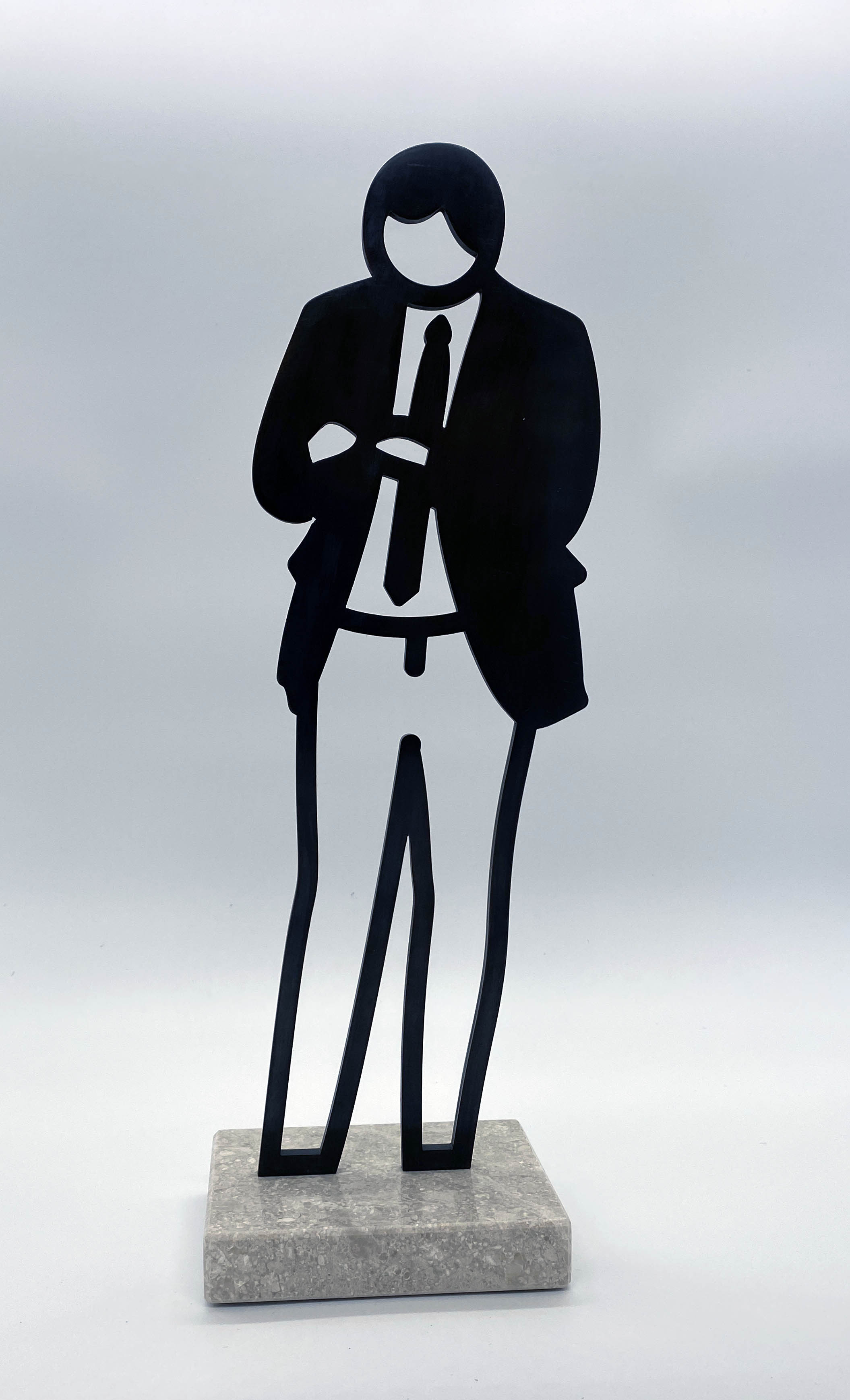This patinated bronze sculpture exemplifies Opie's characteristic reduction of human form to essential geometric elements, translating his signature digital aesthetic into three-dimensional sculptural language. The work continues the artist's exploration of contemporary portraiture through minimalist abstraction, presenting a figure stripped of individualistic detail yet retaining immediate human recognition.