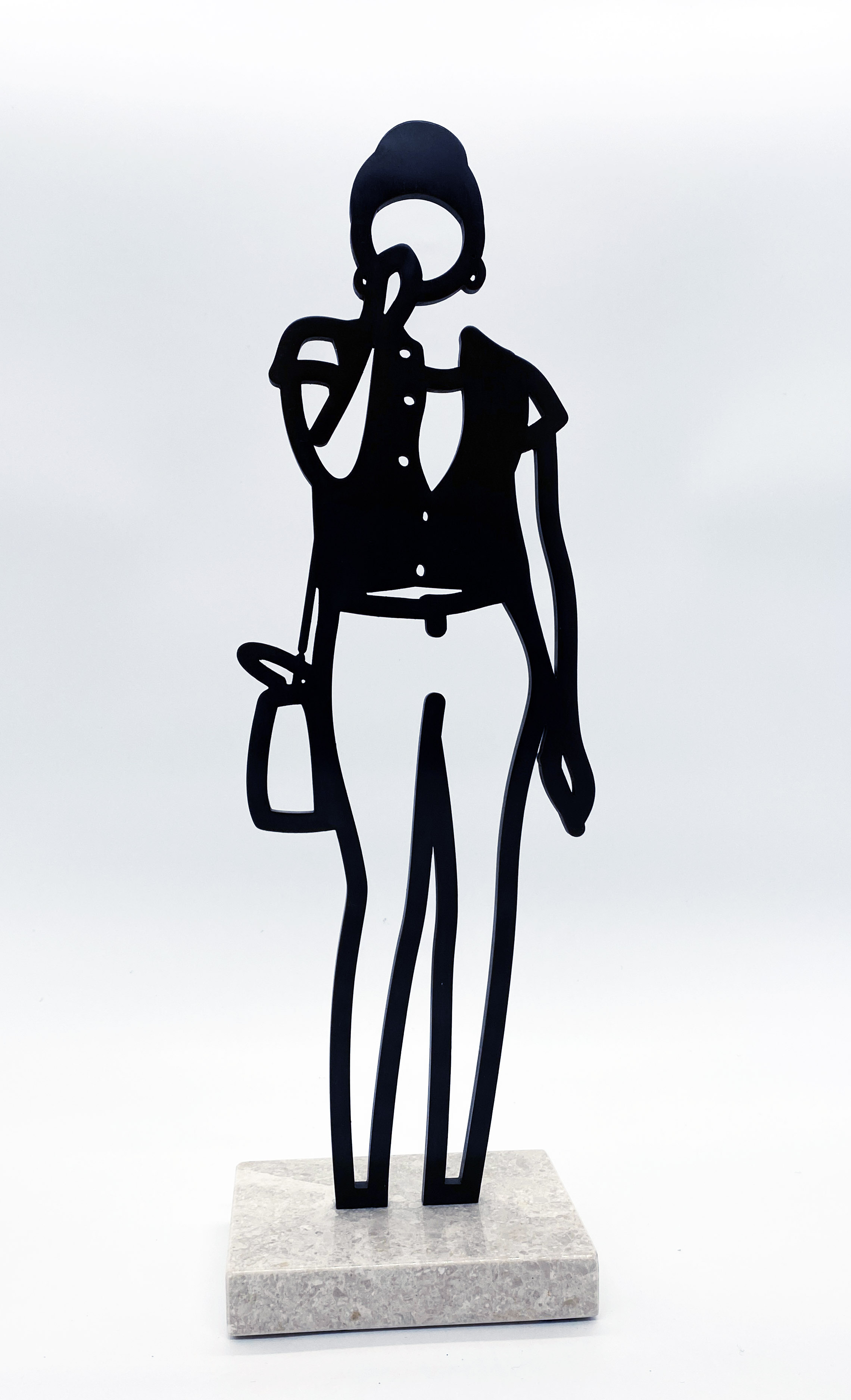 This bronze sculpture represents Opie's distinctive reduction of human form to essential geometric elements, translating his signature minimalist aesthetic from digital media into three-dimensional bronze. The work exemplifies the artist's ongoing exploration of contemporary portraiture, capturing the essence of modern dress and posture through stark simplification and material contrast.