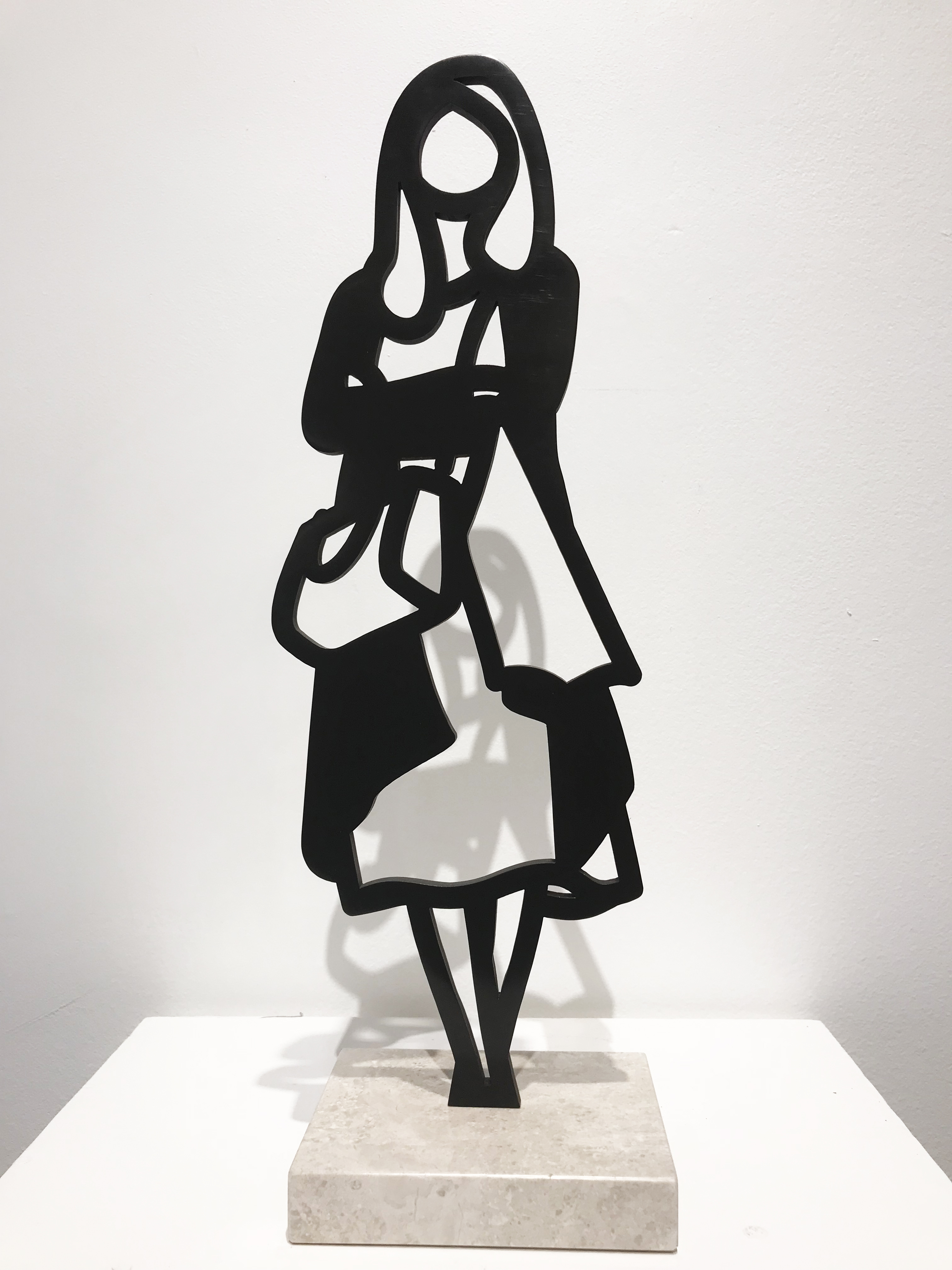 Part of Opie's acclaimed Melbourne Statuettes series, this bronze figure exemplifies the artist's signature reduction of human form to essential linear elements, translating his characteristic digital aesthetic into three-dimensional sculptural form. The patinated bronze surface contrasts with the light stone base, creating a striking minimalist interpretation of contemporary portraiture.