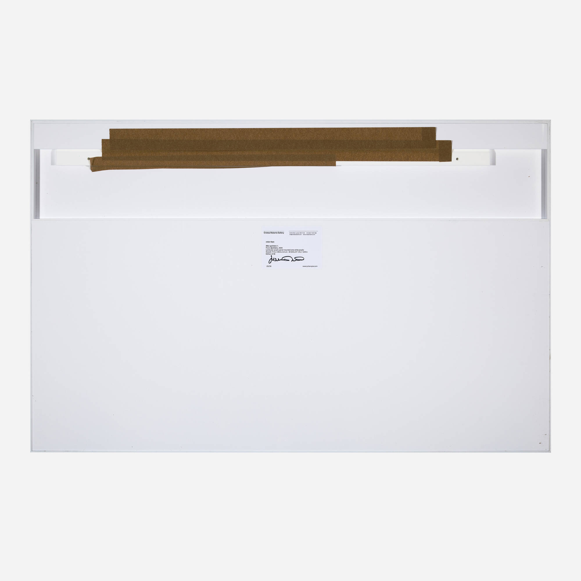 This lenticular acrylic panel artwork depicts male sprinters in motion, part of a series exploring athletic movement and contemporary figure representation. The lenticular technology creates a dynamic visual effect that shifts perspective as the viewer's position changes, adding kinetic quality to the static image. Mounted on white acrylic, the work combines digital imaging with optical technology to create an engaging optical experience. The piece demonstrates the artist's interest in merging traditional figuration with modern technological processes.