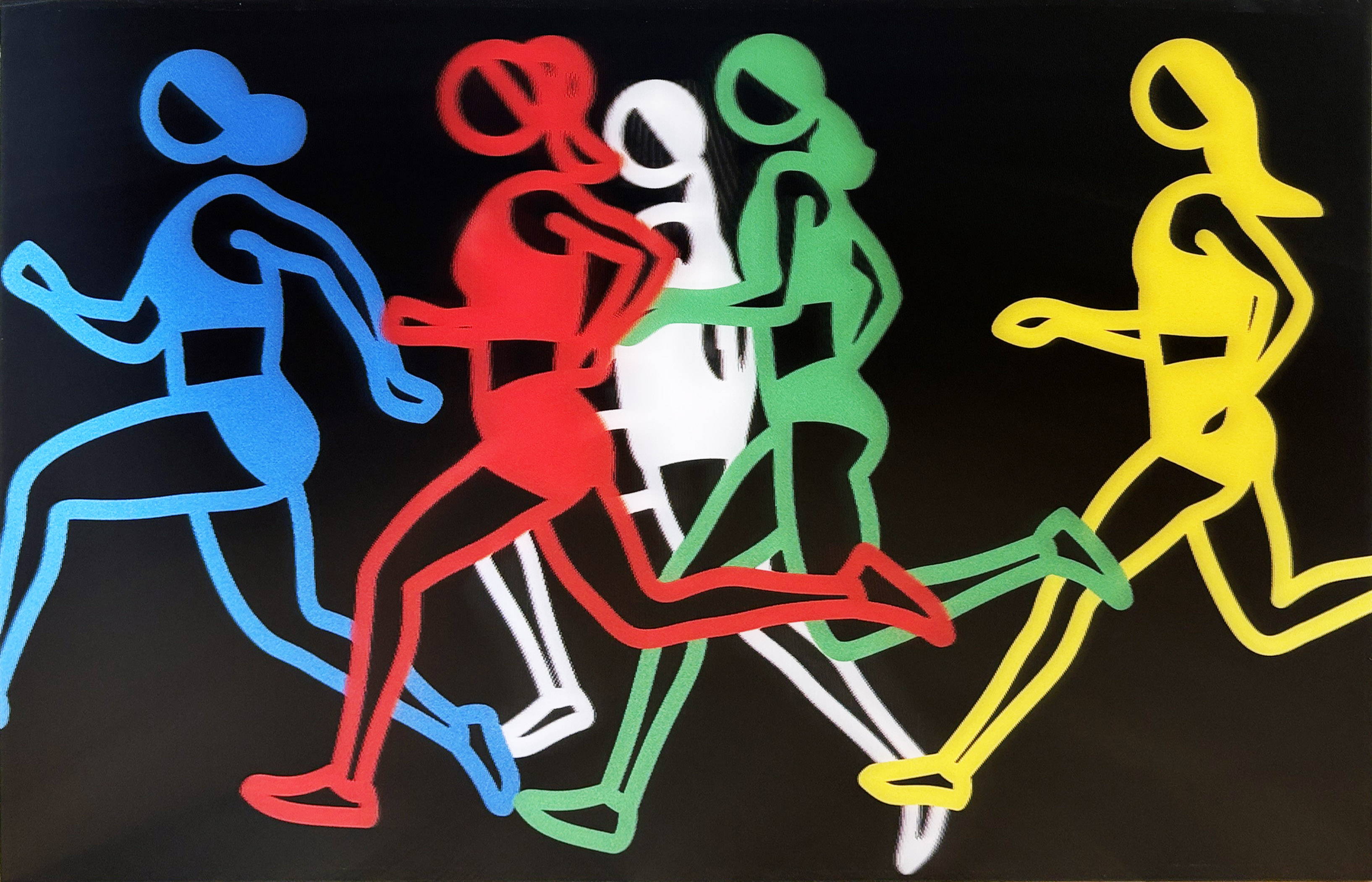 This lenticular work captures Opie's signature reduction of human forms to essential linear elements, utilizing the medium's animated properties to suggest the dynamic motion of female athletes in stride. The piece exemplifies the artist's ongoing exploration of movement and identity through his distinctive minimalist visual language.