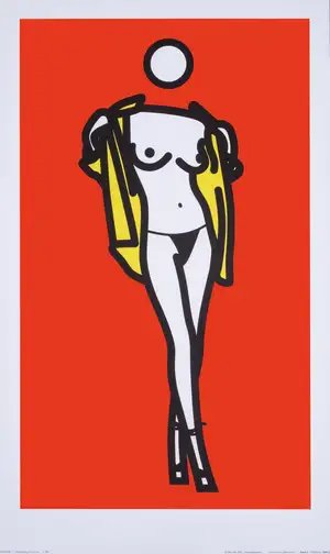 Julian Opie's 2003 screenprint "Woman Taking Off Man's Shirt" presents a simplified, graphic composition characteristic of the artist's distinctive style that reduces figurative forms to essential linear outlines and flat color fields. The work, printed on thick wove paper in a generous horizontal format of 1000 by 600 millimeters, captures an intimate domestic moment through Opie's signature approach of stripping away detail to emphasize gesture and human interaction. Published by K21 Kunstammlung Nordrhein-Westfalen in Düsseldorf, this screenprint exemplifies Opie's engagement with contemporary life and his exploration of how simplified visual language can convey narrative and emotion.