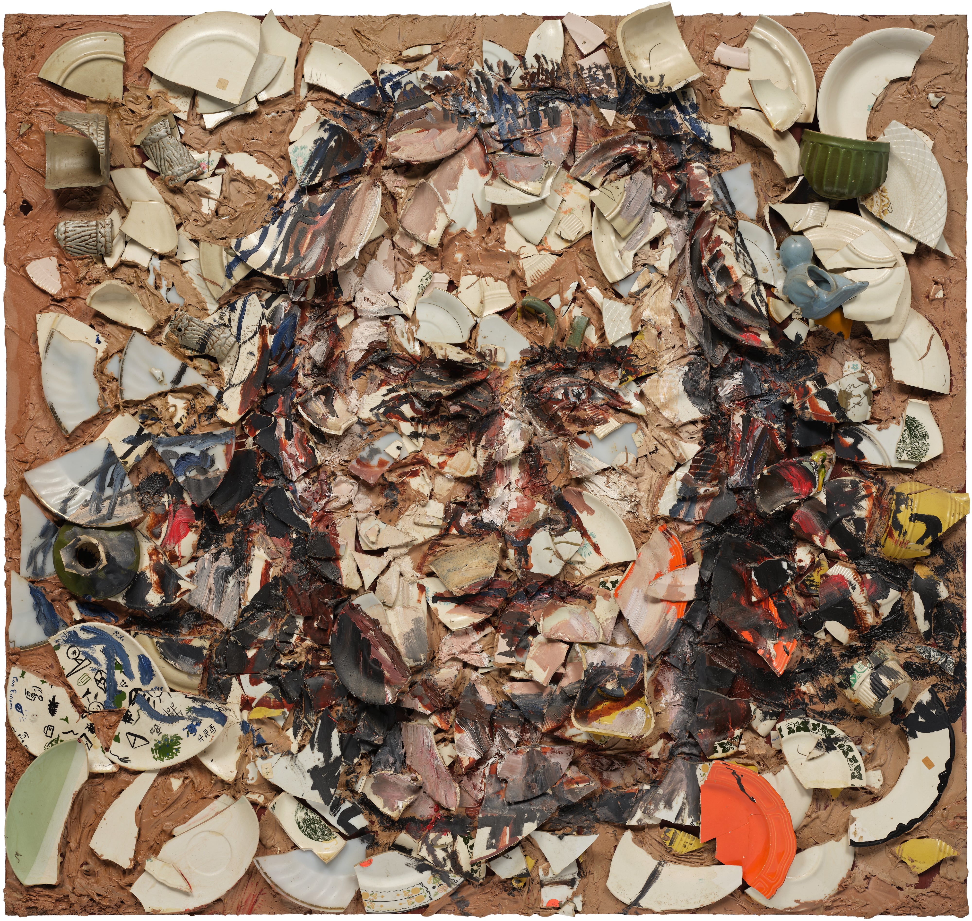 A monumental work from Julian Schnabel's iconic broken plate series, this portrait of Italian art critic and dealer Mario Diacono exemplifies the artist's signature technique of embedding shattered ceramic fragments into a densely textured surface. The jutting shards create a dynamic, almost violent topography that challenges traditional notions of portraiture, while the oil paint and Bondo filler merge to produce an intensely raw and tactile presence. The result is a commanding fusion of destruction and creation that reflects both Schnabel's neo-expressionist vision and his subject's prominent role in the avant-garde art world.
