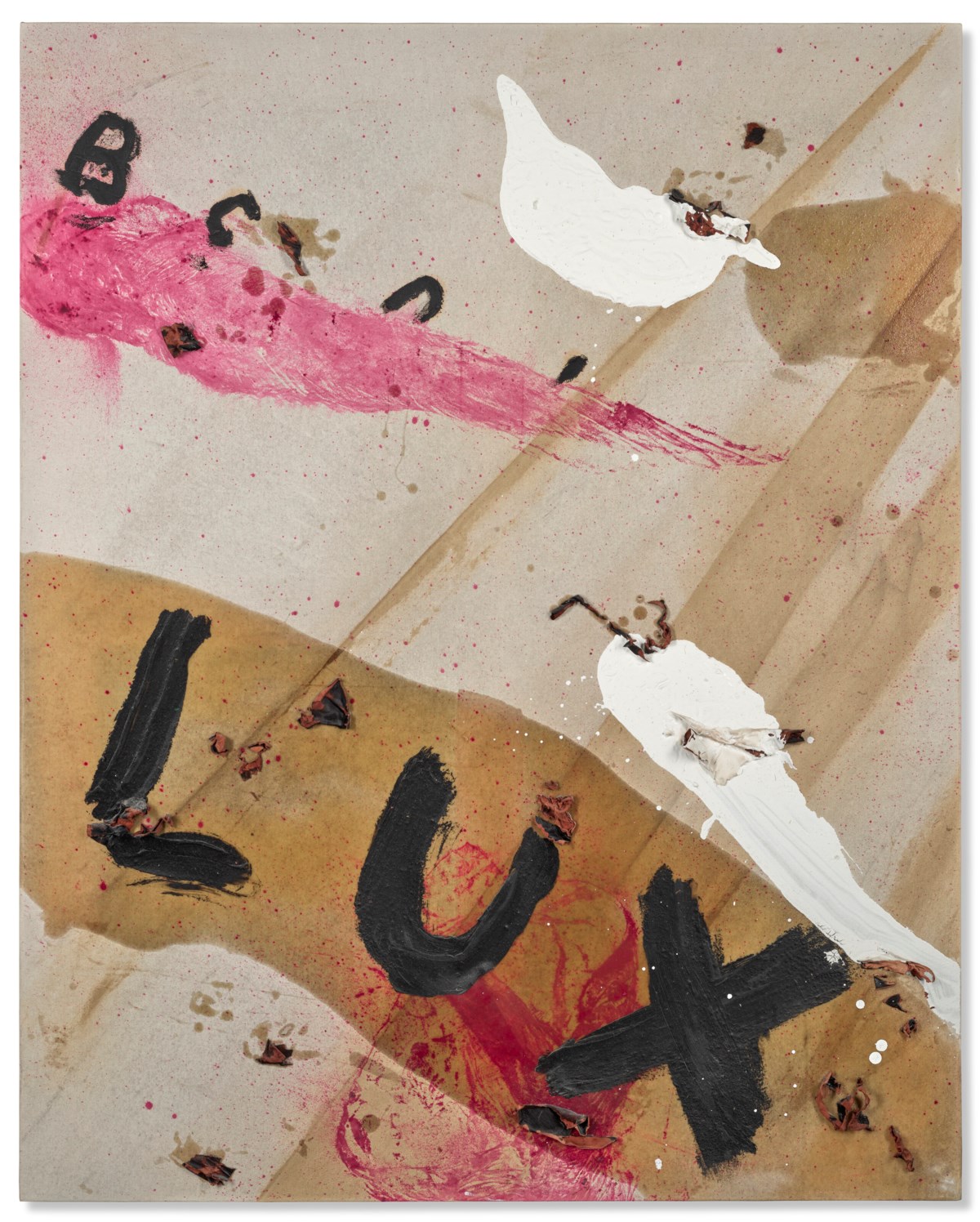 A monumental work by Julian Schnabel, *Sans titre (Boni Lux)* showcases the artist's signature embrace of unconventional materials, combining oil, resin, gesso, and leather on canvas to create a richly textured, tactile surface. The interplay of these layered media produces a dynamic tension between the painterly and the sculptural, a hallmark of Schnabel's bold and expressive approach. The work exemplifies his ability to transform raw, disparate materials into a unified, emotionally charged visual experience.