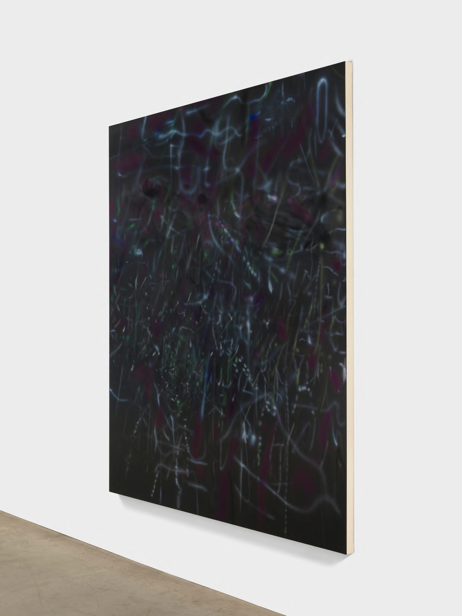 A vortex of layered mark-making pulls the eye inward across this monumental 2025 canvas, where Julie Mehretu orchestrates cascading fields of ink and acrylic into something that feels simultaneously cosmological and deeply intimate. Architectural fragments, calligraphic gestures, and spectral washes of pigment accumulate in dense strata before dissolving into luminous, nearly atmospheric passages, creating a visual experience that resists resolution at any single focal point. The title's parenthetical acknowledgment of ocular limitation is embedded in the work's very structure, where perception is perpetually deferred and the viewer is invited to chase meaning through successive layers of erasure and inscription. Mehretu has long been celebrated for paintings that compress geopolitical tension, historical memory, and formal abstraction into singular, overwhelming fields of energy, and this work deepens that practice with a quality of sustained introspection that distinguishes her most recent output. At 96 by 84 inches, the canvas commands bodily engagement, and the sheer scale transforms the act of looking into something closer to inhabiting, a condition the title seems to anticipate and theorize. The relationship between the written word and the visual field, always a productive tension in her work, here becomes almost theological, concerned with what exceeds representation and what images can only gesture toward. Currently offered through Marian Goodman Gallery New York, this painting represents an exceptional opportunity to acquire a major work from one of the most consequential painters working today, at a moment when institutional and critical consensus around her importance continues to solidify globally.