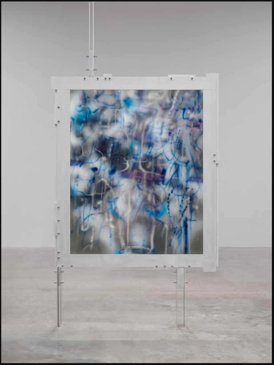 In TRANSpaintings (blue) / Upright Brackets, completed in 2024, Julie Mehretu layers ink and acrylic onto monofilament polyester mesh, a support that fundamentally transforms how paint exists in space. The translucent ground refuses to behave like canvas or paper, allowing light to pass through the work and casting the painted marks as something simultaneously present and dissolving. Mehretu has built a composition of compressed, kinetic energy, where gestural striations, architectural fragments, and cartographic residue accumulate and collide across the surface, suggesting both explosion and suspension caught in a single frozen instant. The choice of mesh as support carries conceptual weight that extends well beyond formal innovation. By working on a material associated with construction, scaffolding, and industrial process, Mehretu situates painting within a conversation about infrastructure, visibility, and what structures are allowed to stand. The blue palette here deepens these associations, evoking both institutional space and atmospheric depth, pulling the eye into passages of layered incident before releasing it again toward areas of near-transparency. The work rewards sustained looking, revealing successive strata of mark-making that resist any single resolved reading. Offered through Marian Goodman Gallery New York, this work arrives at a moment when Mehretu's investigation into the political and physical geology of painting has reached particular urgency. Measuring 182.9 by 152.4 centimeters, the painting occupies a scale that is genuinely bodily without becoming monumental, holding the viewer in an intimate negotiation with its compressed complexity. For collectors committed to work that operates simultaneously as aesthetic experience and critical proposition, TRANSpaintings (blue) / Upright Brackets represents one of the most significant offerings in Mehretu's recent practice.