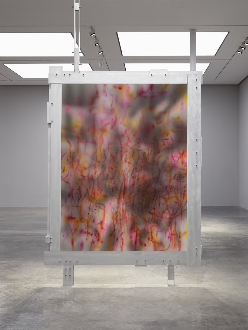 Suspended on monofilament polyester mesh rather than conventional canvas, "TRANSpaintings (gay guerrilla) / Upright Brackets" achieves a luminous, almost atmospheric presence in which layers of ink and acrylic seem to float independently of one another. Completed in 2024, the large-scale work measures 274.3 x 213.4 centimeters and benefits enormously from its unconventional support, which allows light to pass through the surface and activates the composition from multiple angles. Mehretu's characteristic vocabularies of gestural mark-making, architectural notation, and fragmented cartographic systems collide here with a charged political consciousness embedded directly in the title, referencing both trans identity and the legacy of queer resistance with an urgency that is anything but incidental to the visual experience. The work belongs to a pivotal body of paintings in which Mehretu continues to deepen her engagement with questions of erasure, visibility, and historical accumulation. The mesh substrate introduces a physical translucency that mirrors the thematic concerns of the series, evoking bodies and identities that exist in states of becoming, contested presence, and hard-won assertion. Layers that might read as pure abstraction reward closer attention, yielding traces of source imagery absorbed and transformed through the artist's rigorous process of construction and deliberate obscuration. Currently presented at Marian Goodman Gallery New York, this work represents a significant acquisition opportunity within Mehretu's evolving practice. Her position in major institutional collections worldwide, combined with sustained critical recognition and the particular timeliness of the TRANSpaintings series, makes this a work of both cultural consequence and lasting market relevance for a serious collection.