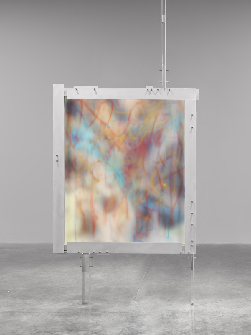 Suspended between surface and atmosphere, "TRANSpaintings (mouth flight) / Upright Brackets" presents Julie Mehretu working at the intersection of material transparency and layered mark-making in a way that feels genuinely new within her already expansive practice. Created in 2024, the work deploys ink and acrylic on monofilament polyester mesh, a choice that fundamentally transforms how paint occupies space. Rather than resting on a solid ground, Mehretu's gestures exist within a semi-transparent field, allowing light to pass through, shadows to participate, and the wall behind to become an active component of the composition. At 182.9 by 152.4 centimeters, the work commands physical presence while simultaneously appearing to dissolve at its edges, a tension between weight and weightlessness that is central to its power. The title itself signals Mehretu's characteristically dense thinking. "Mouth flight" evokes both utterance and escape, the moment language launches itself into open air, while "Upright Brackets" suggests structural containment and typographical framing. Together they describe a work that is concerned with thresholds, with what can be held and what insists on moving beyond its given boundaries. The mesh ground literalizes this preoccupation, functioning as a membrane rather than a barrier, something that gathers marks without fully claiming them. For collectors, this work represents a meaningful departure within Mehretu's 2024 production, extending her long engagement with geopolitical abstraction into genuinely experimental material territory. Offered through Marian Goodman Gallery New York, "TRANSpaintings (mouth flight) / Upright Brackets" carries the rigor and conceptual density that have defined Mehretu's place in contemporary painting while opening formally toward something more provisional and atmospheric.