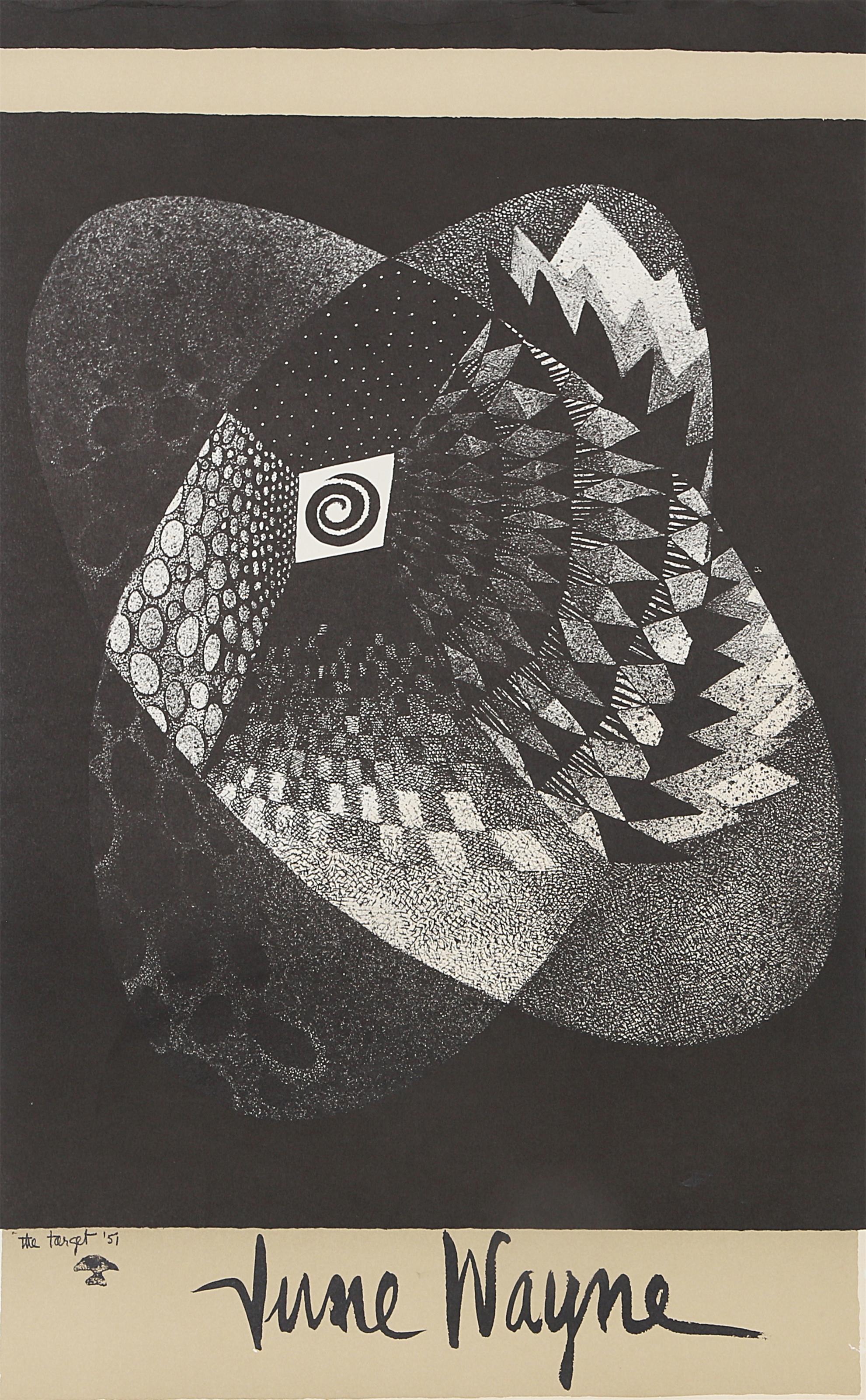 "The Target" is a lithograph poster created by June Wayne, a pioneering American artist known for her contributions to the modernist movement and her innovations in color lithography. The work exemplifies Wayne's bold use of geometric abstraction and vibrant color relationships, characteristic of mid-twentieth-century avant-garde printmaking. As a lithographic poster, the piece demonstrates Wayne's mastery of the medium and her commitment to making fine art accessible through the print format.